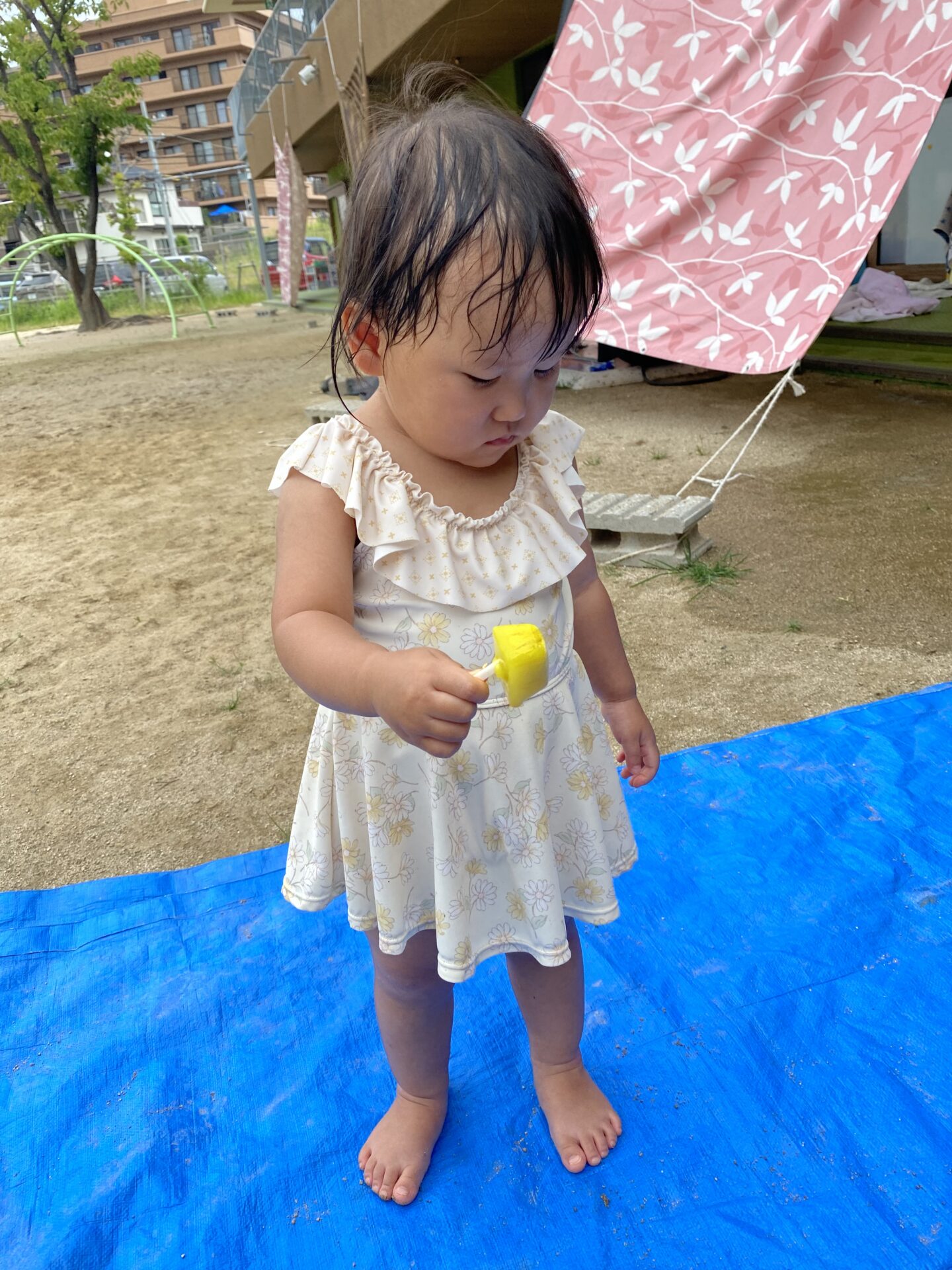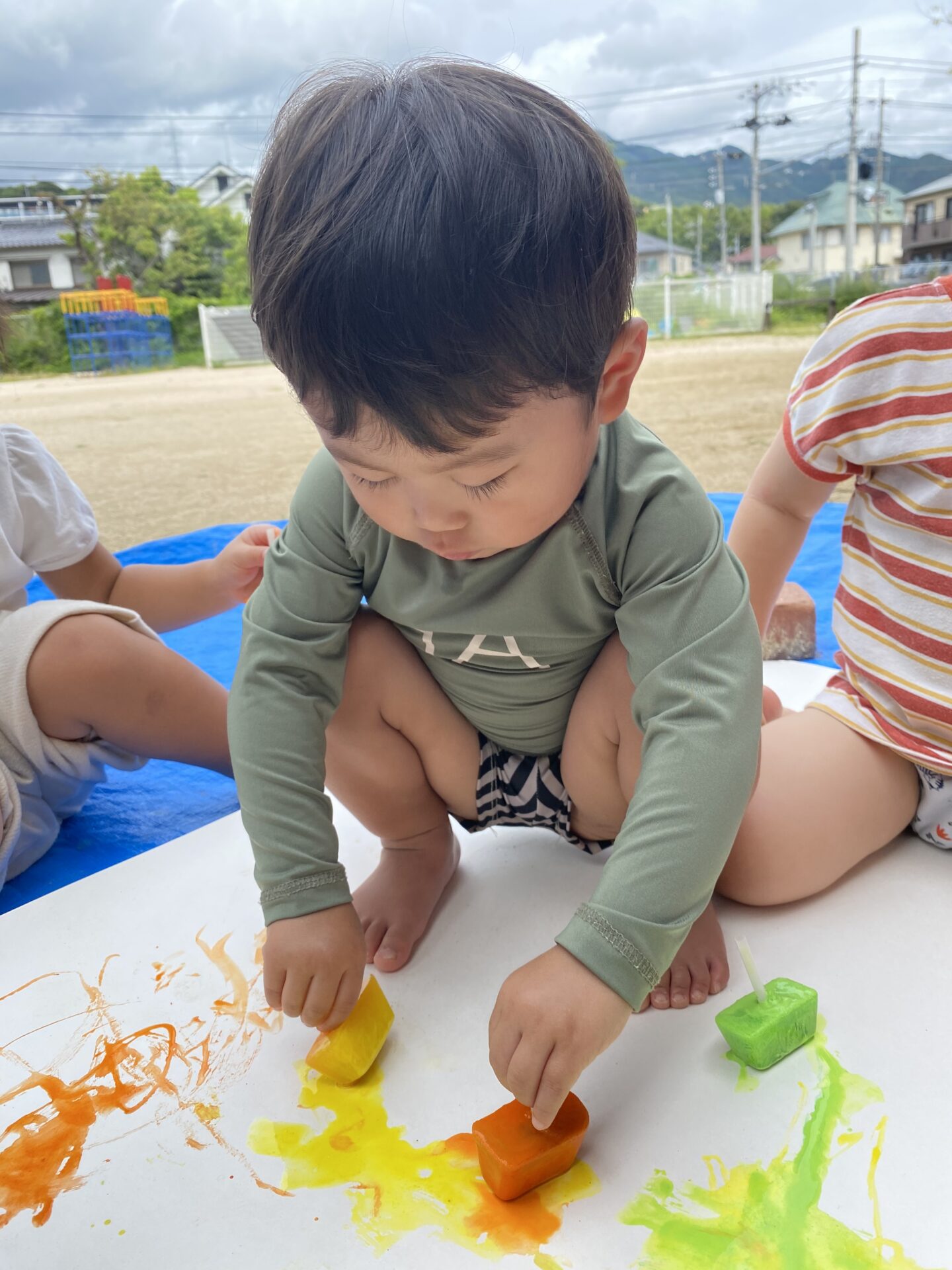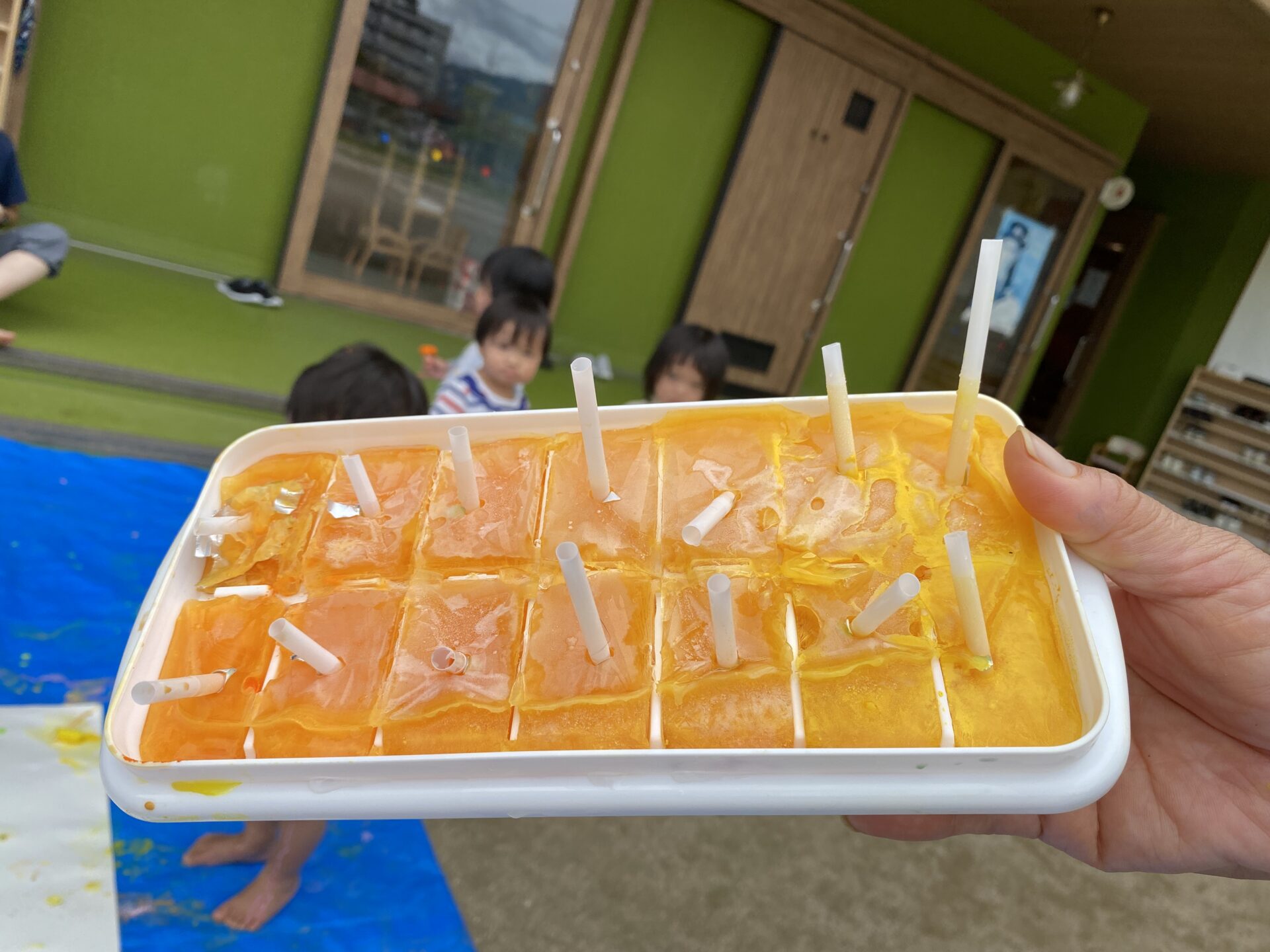 まだまだ暑い日が続く中、だいちチームでは、絵の具で色をつけた氷で、お絵描きをしました。