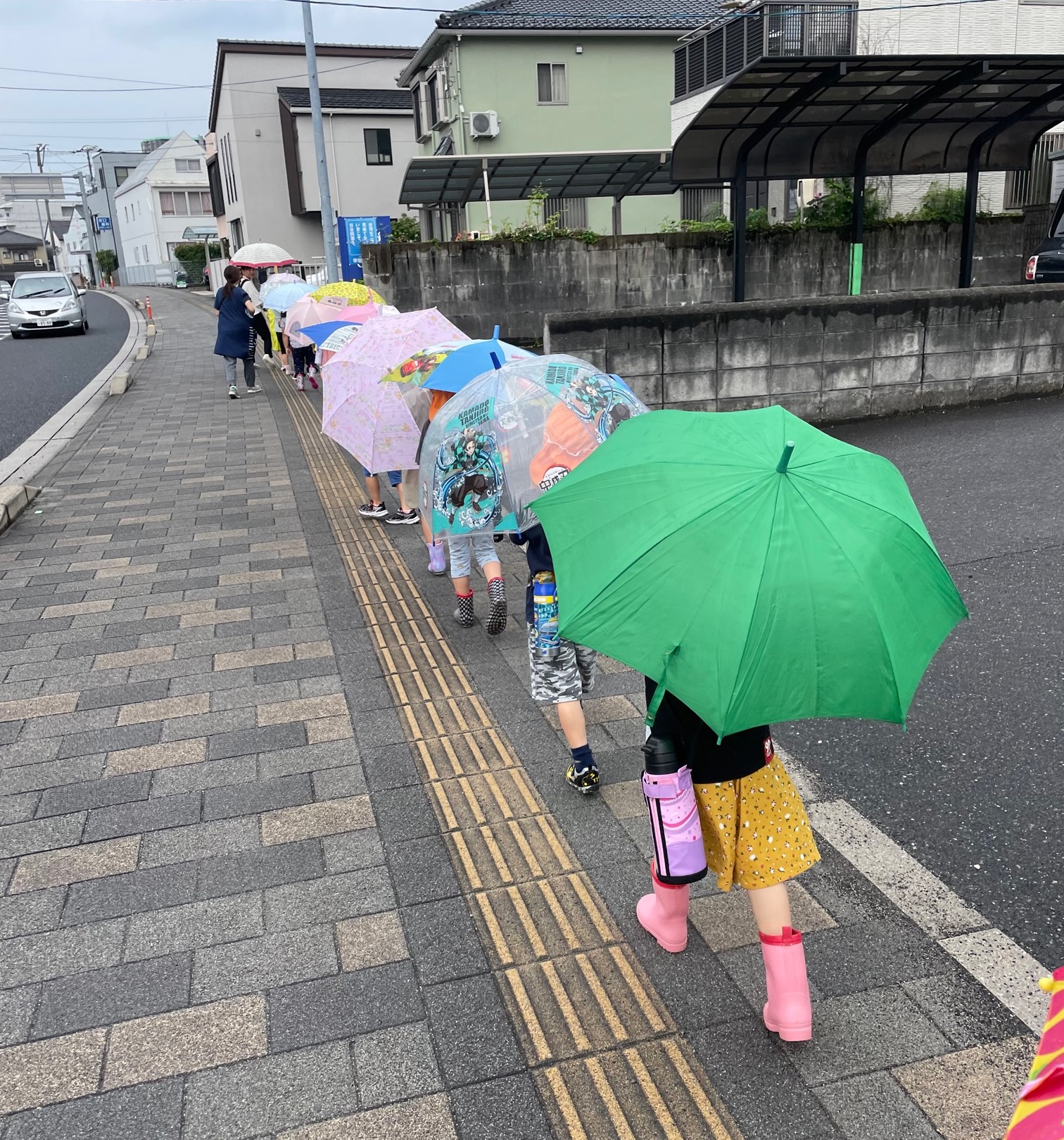 朝から雨が、しとしと降っていましたが、雨具の用意をお家の方いお願いしていたので、傘をさして歩いていきました。