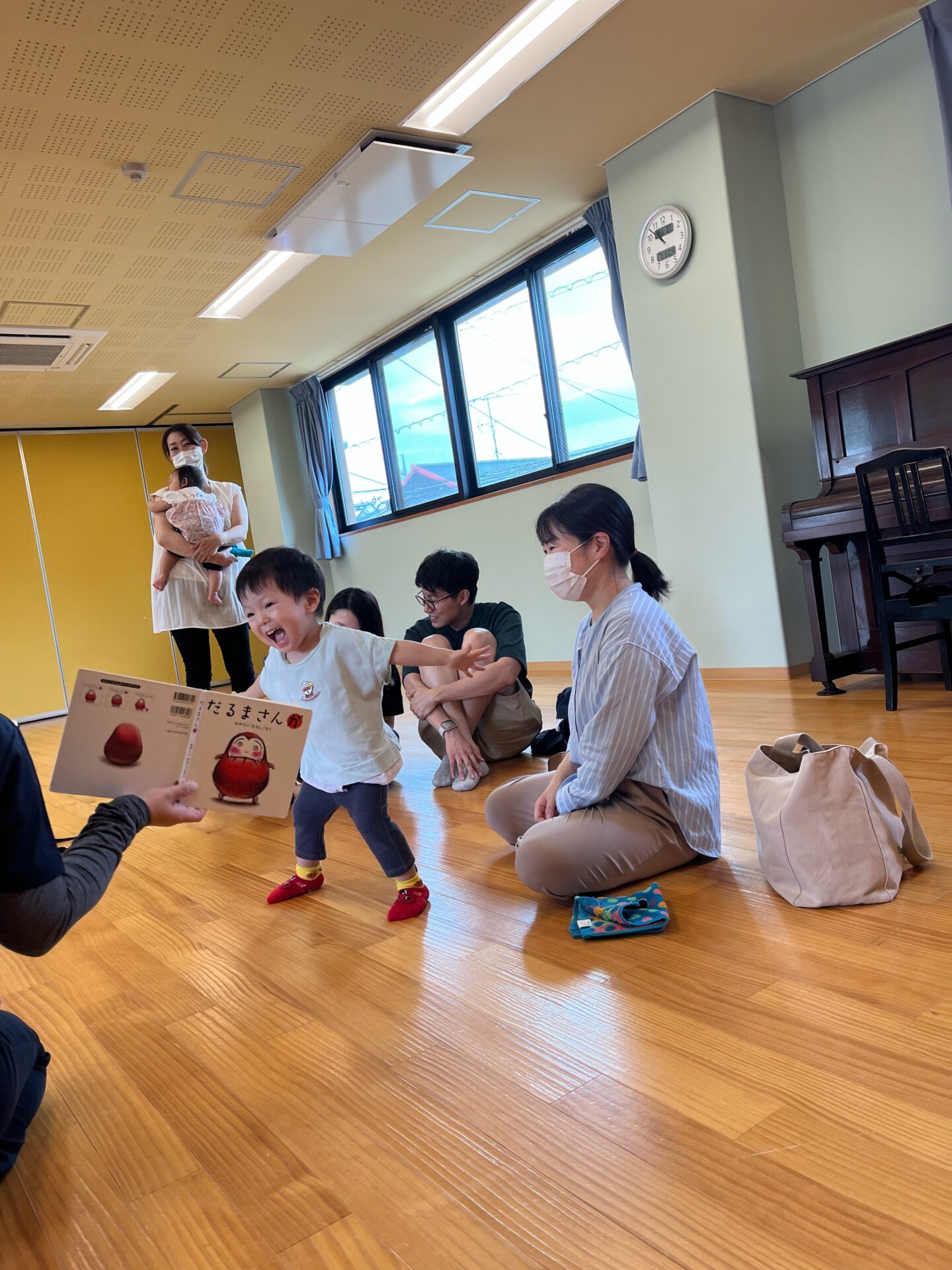 最後の絵本「だるまさんがころんだ」では、だるまさんと同じポーズをまねっこして表現しようとしていました。絵本の世界に入りこんでいる笑顔がとてもかわいいですね。