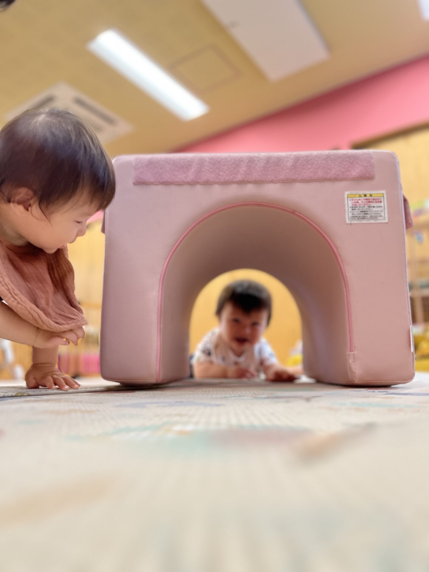 トンネルの両端から「バァ」と顔を出して覗き合って友だちとする「いないいないばぁ」で楽しんでいます。