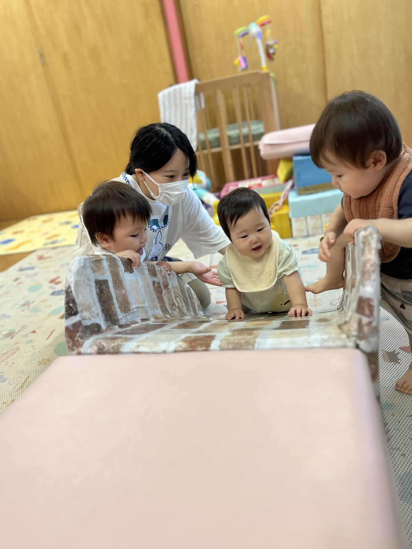 今までは大人にしてもらうはずだった「いないいないばぁ」が友だちとする主体的な「いないいないばぁ」に変わっています。0歳児クラスでも友だちを意識して遊ぶ楽しさを感じることができます。子どもたちの成長をとても微笑ましく思いました。