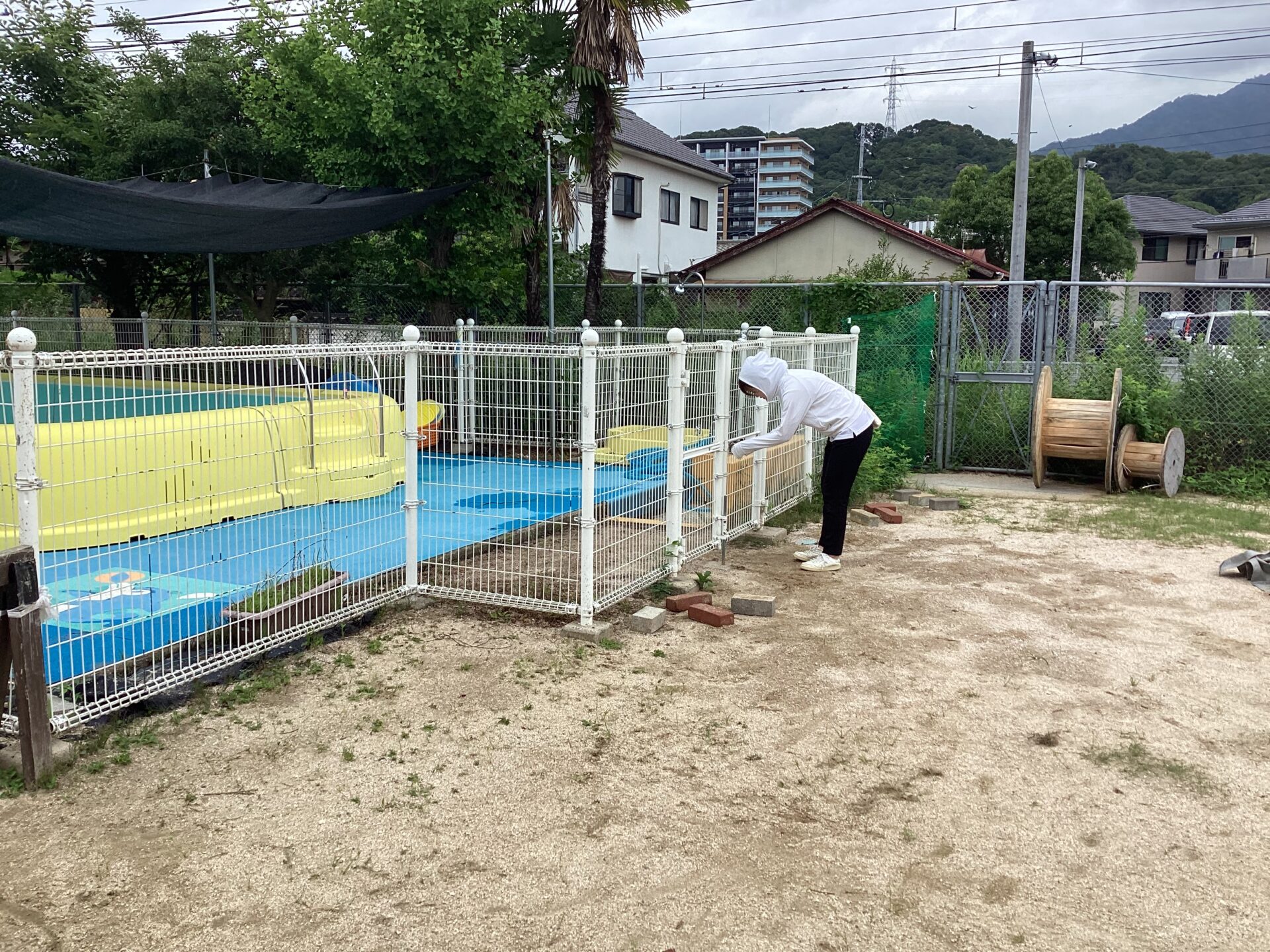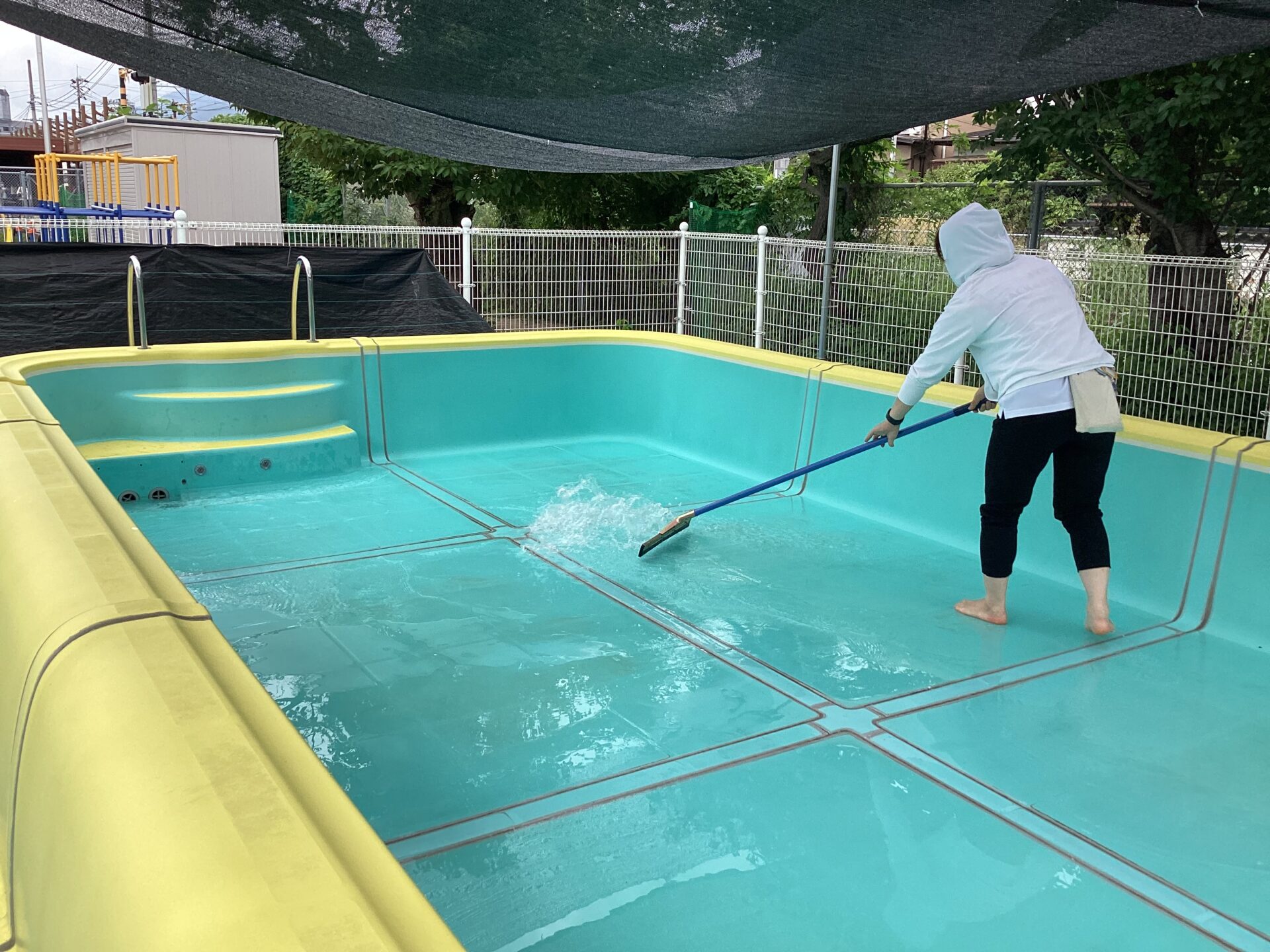 幼児組が午前中プール遊びをしたあとに、先生たちは毎日プール掃除をしています💦