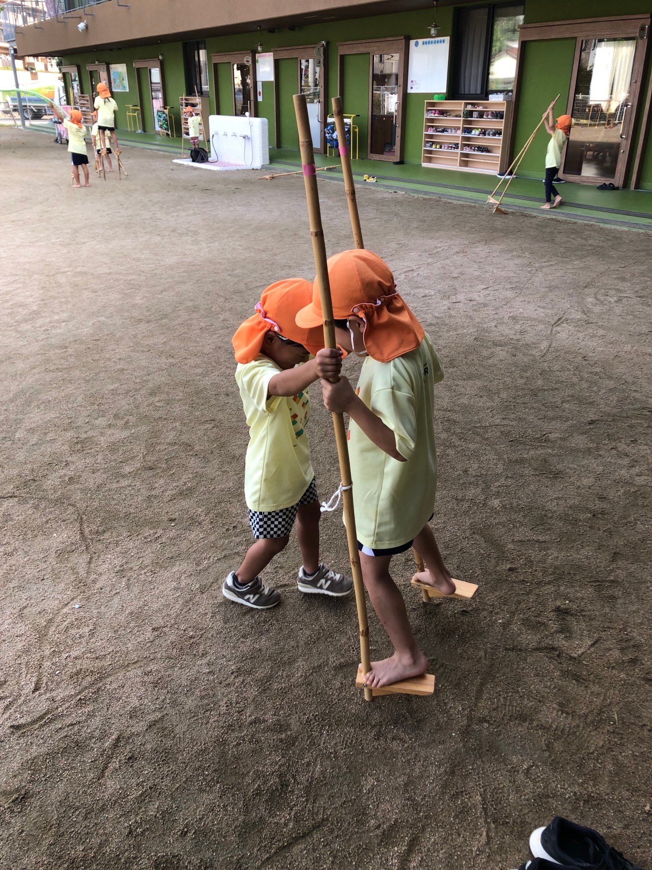 友達の竹馬の練習に、付き合ってくれる優しい仲間の姿を写真におさめることができました。