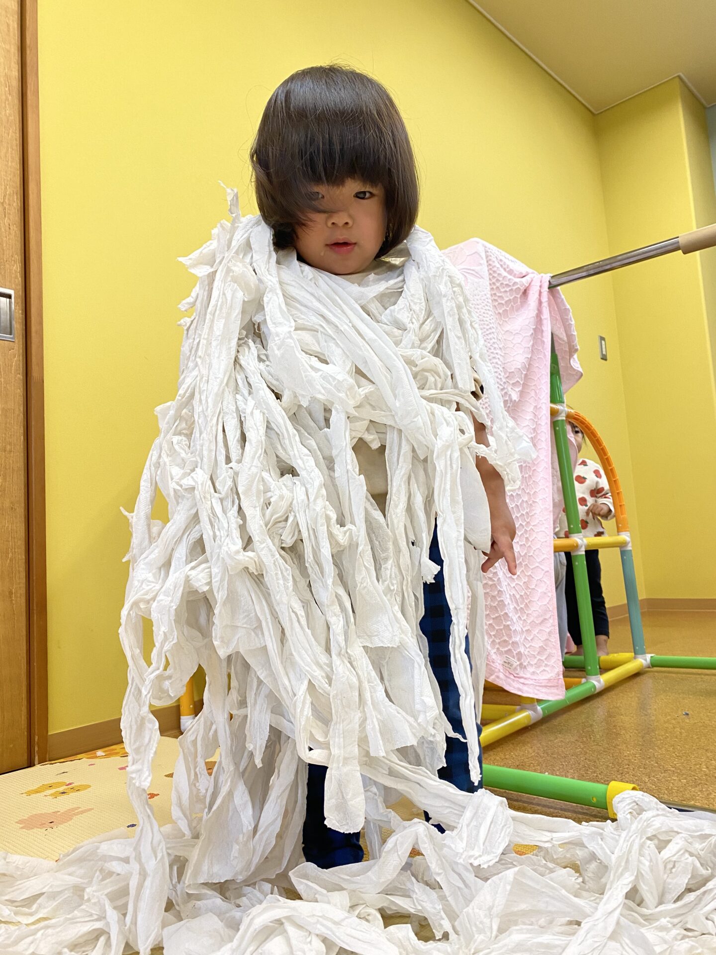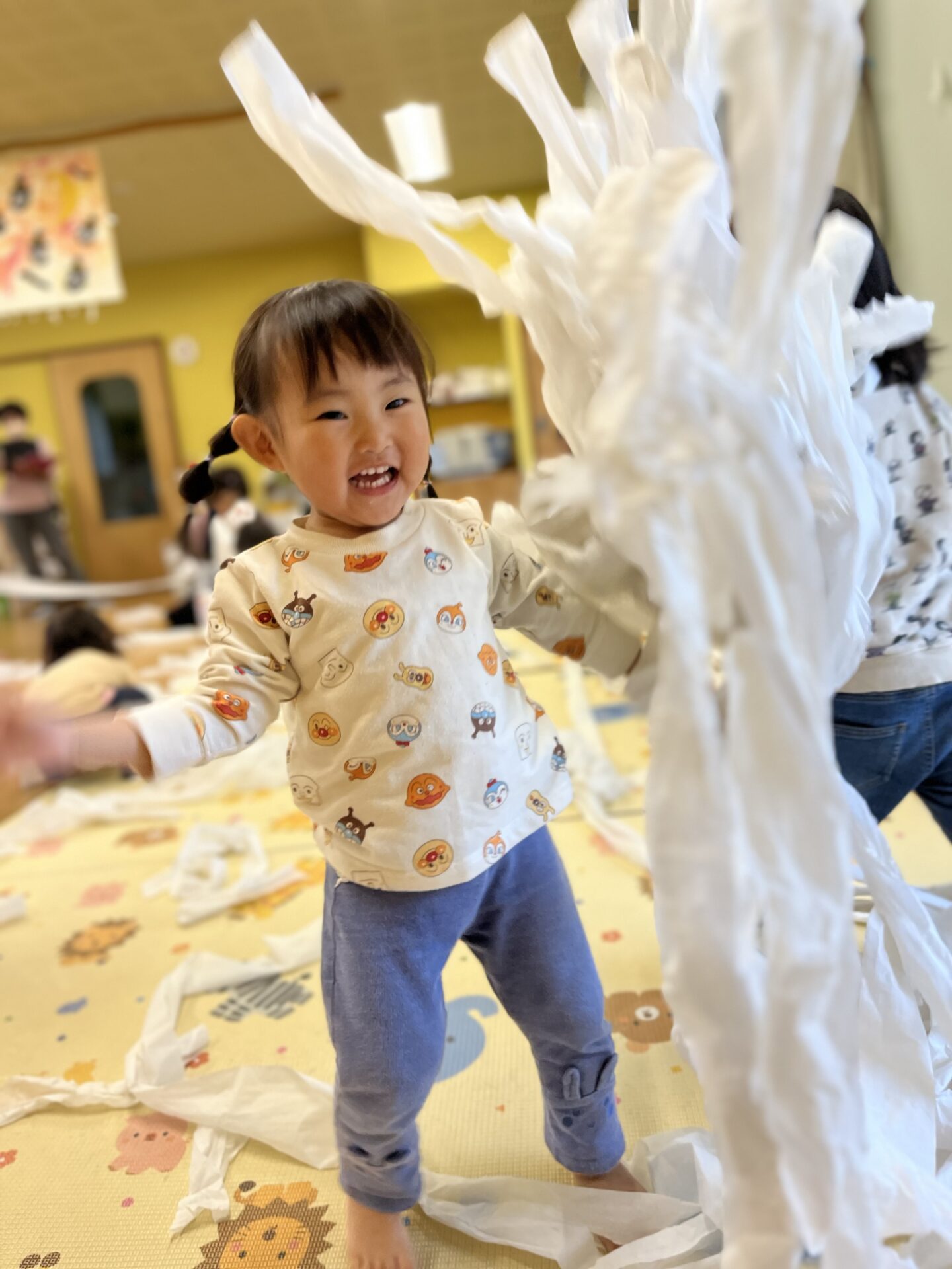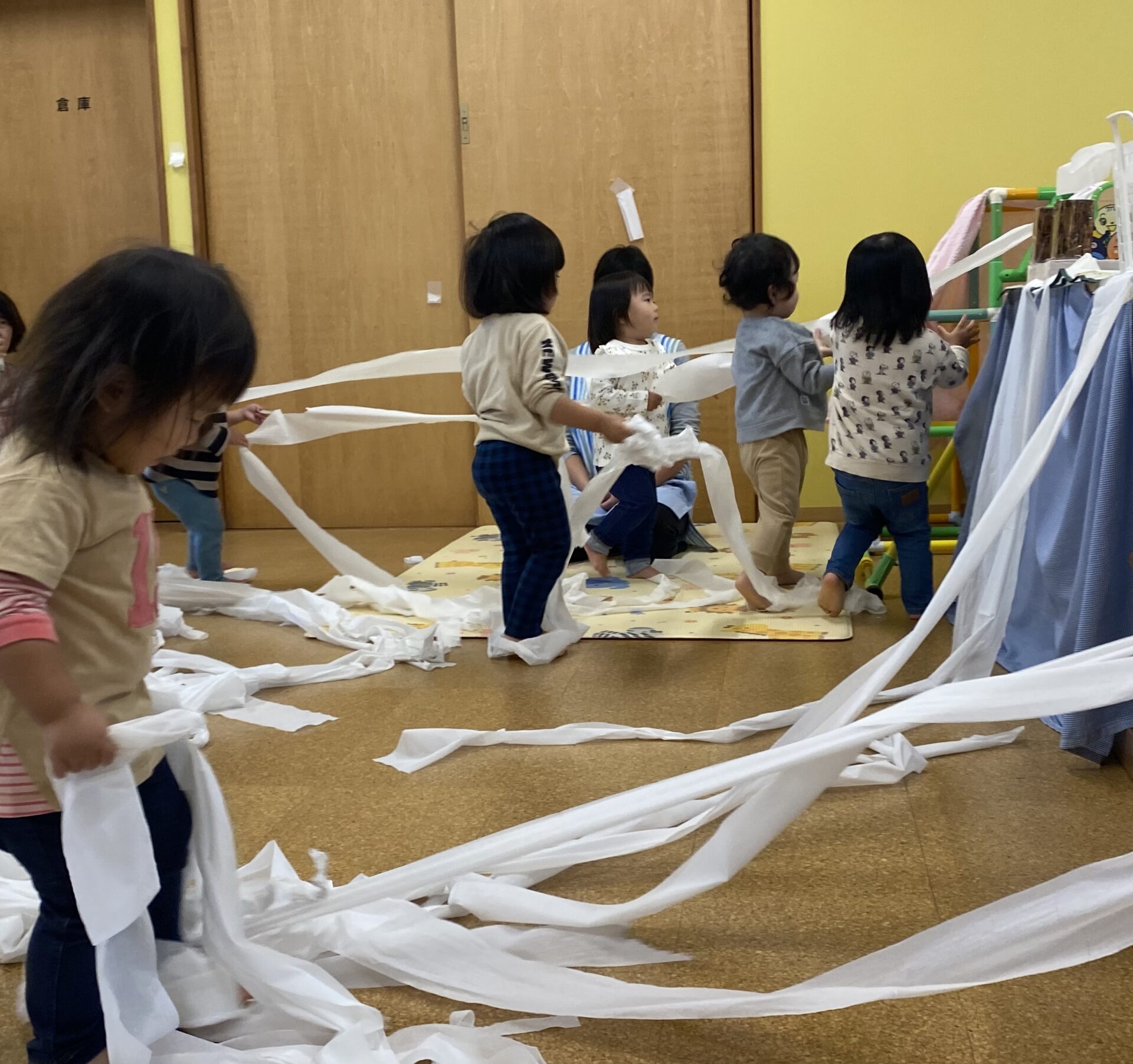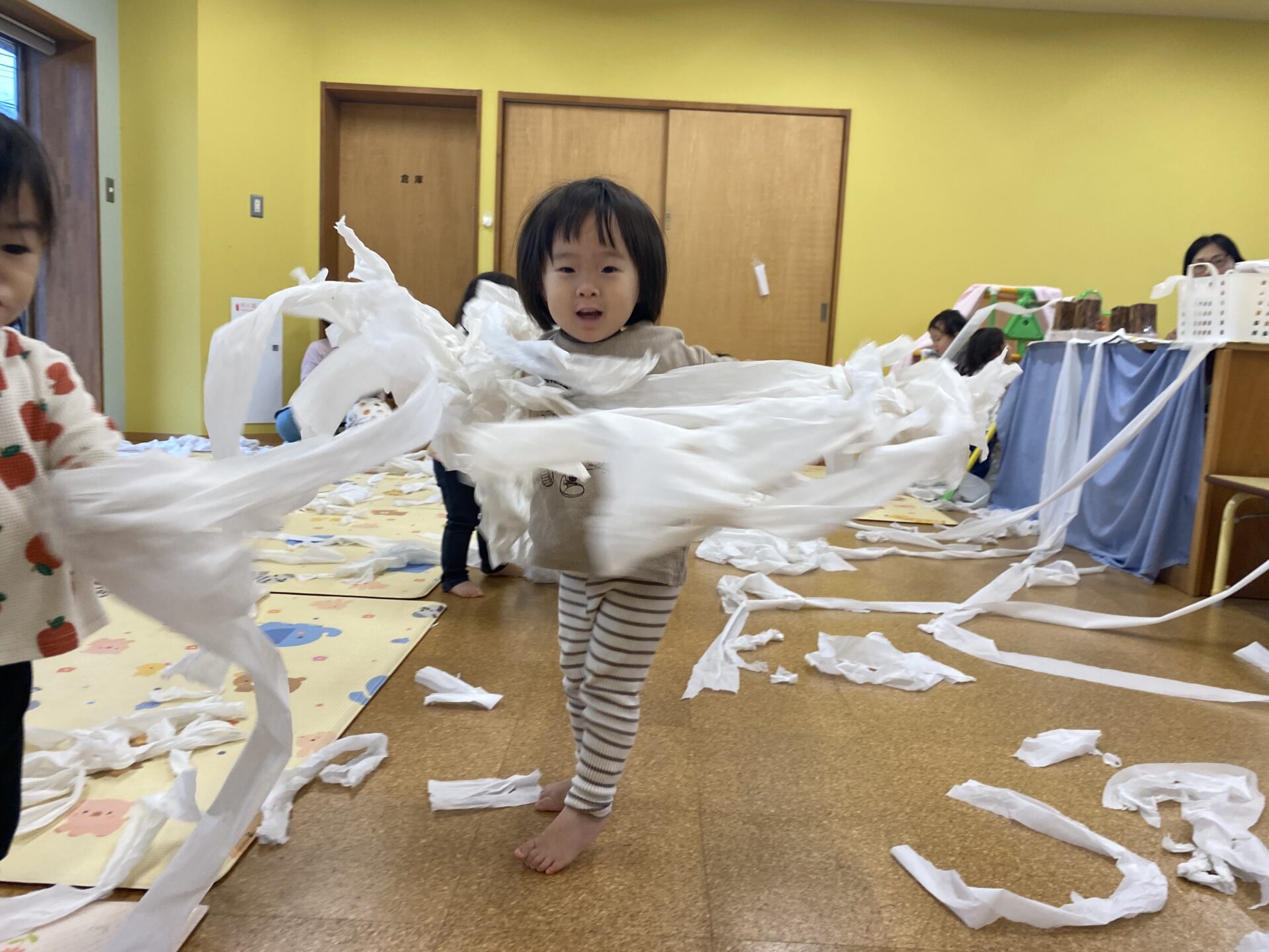 保育室の奥の方で、子どもたちに「今日だけ特別だよ♪トイレでしちゃダメだよ。」とお約束をしてから、いよいよトイレットペーパー遊びのスタートです!