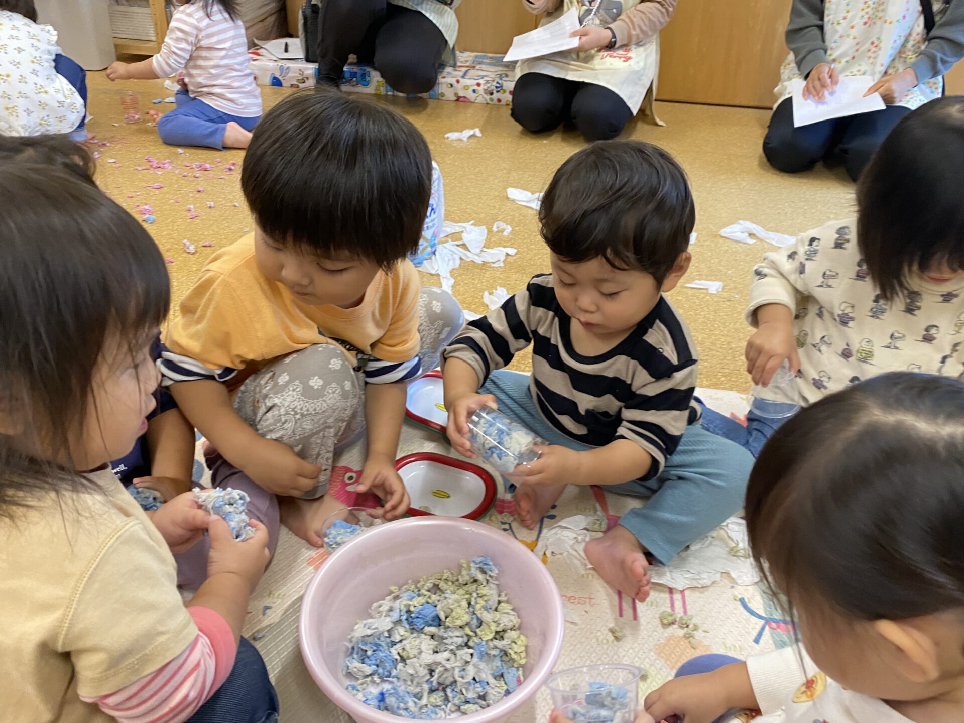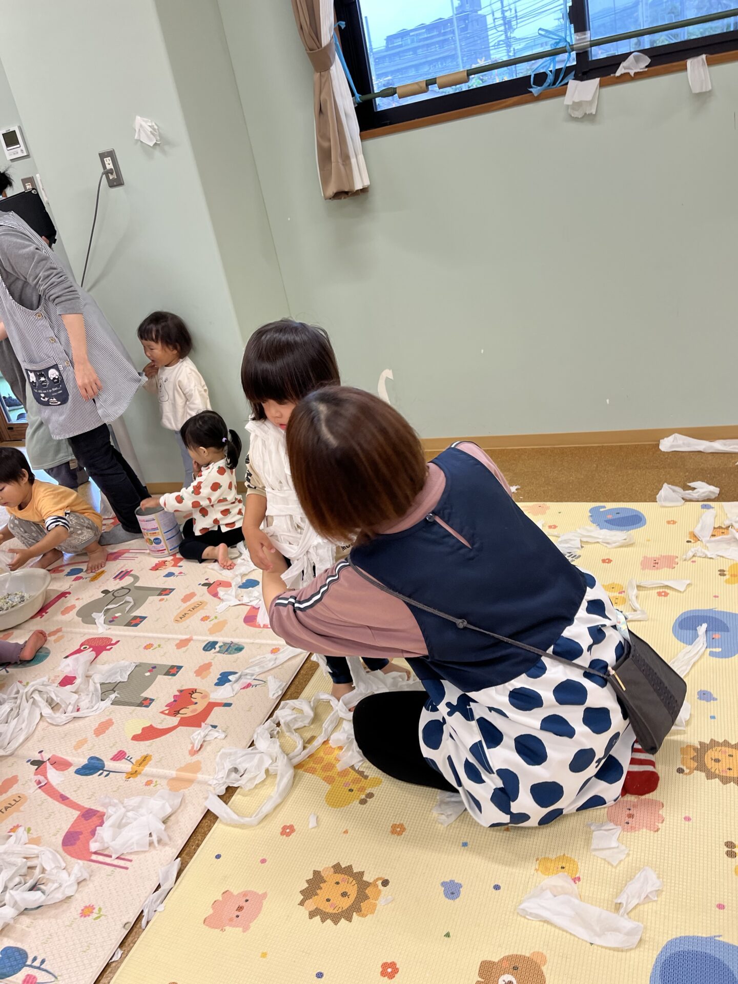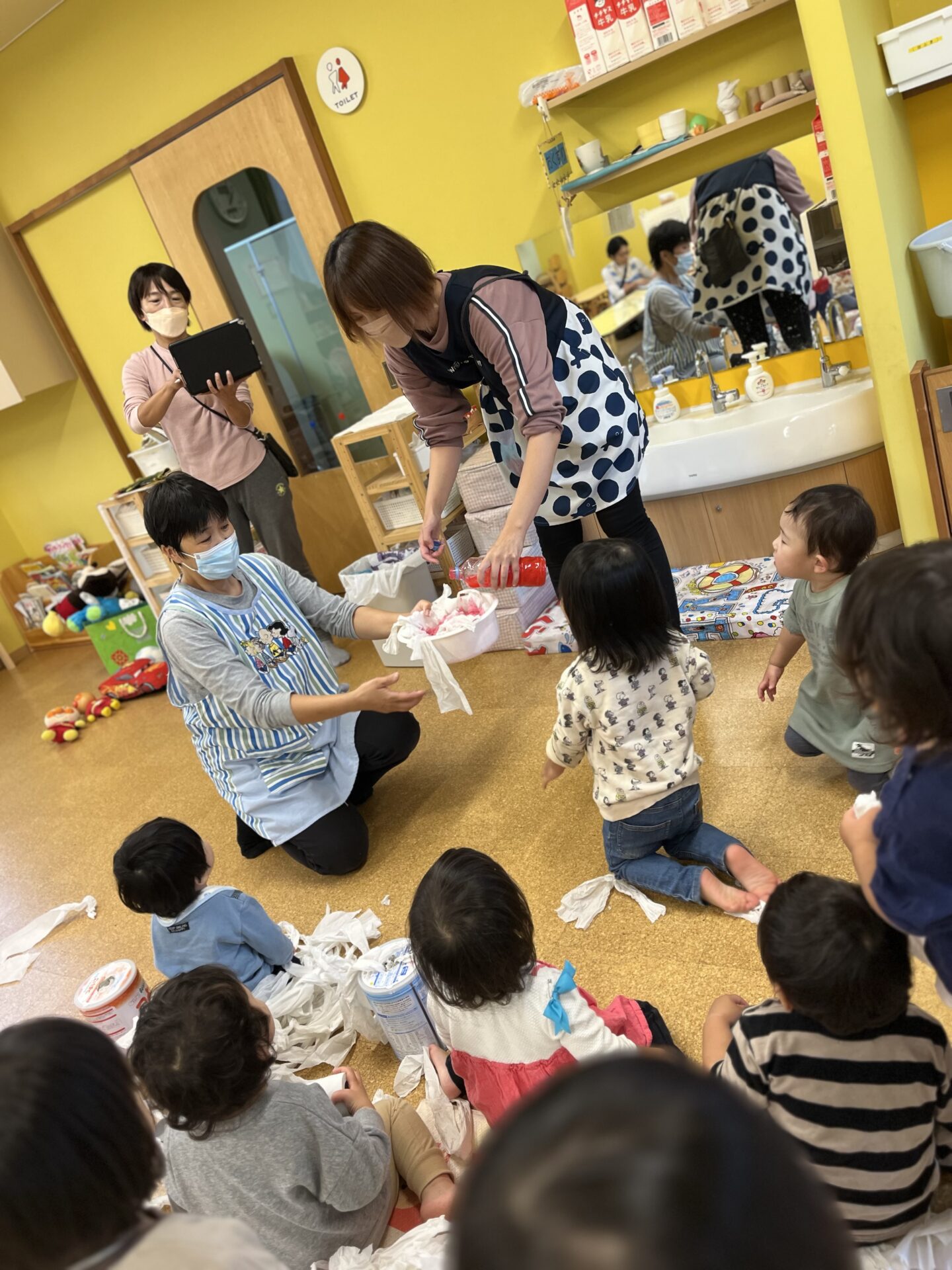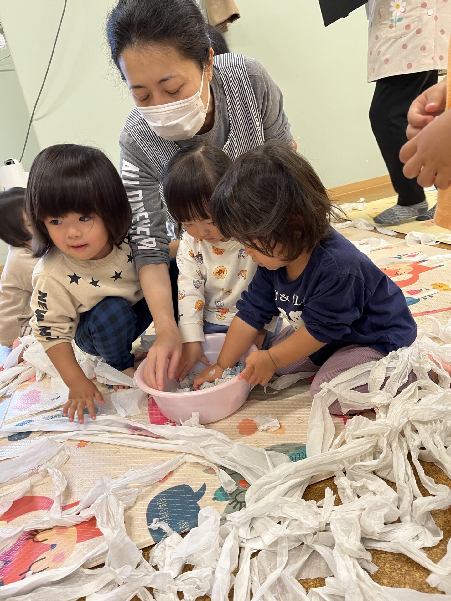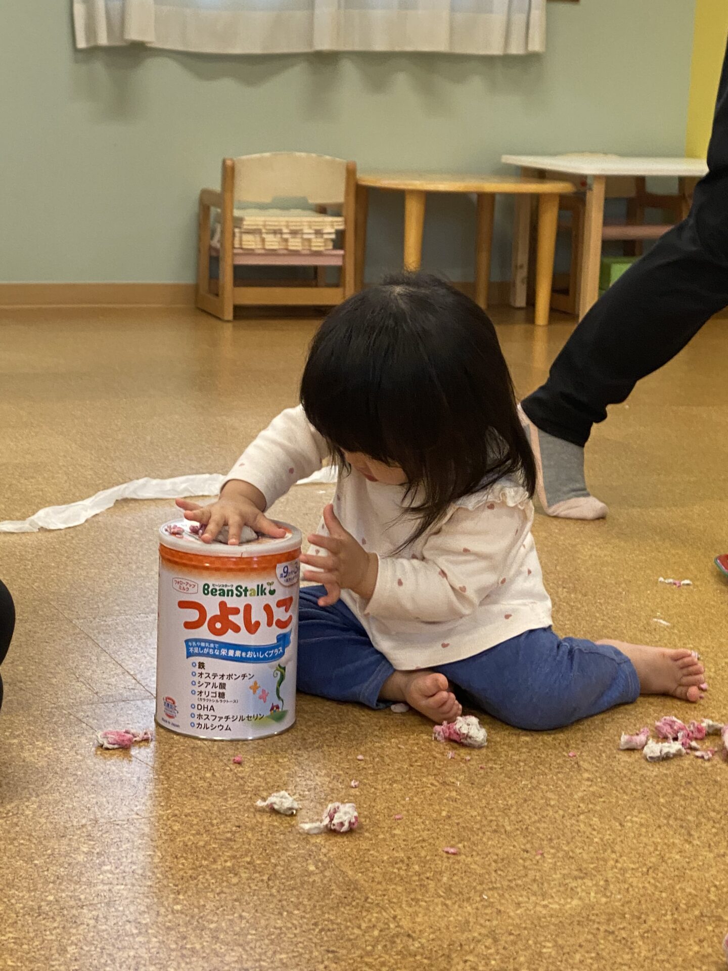 保育室の奥の方で、子どもたちに「今日だけ特別だよ♪トイレでしちゃダメだよ。」とお約束をしてから、いよいよトイレットペーパー遊びのスタートです!