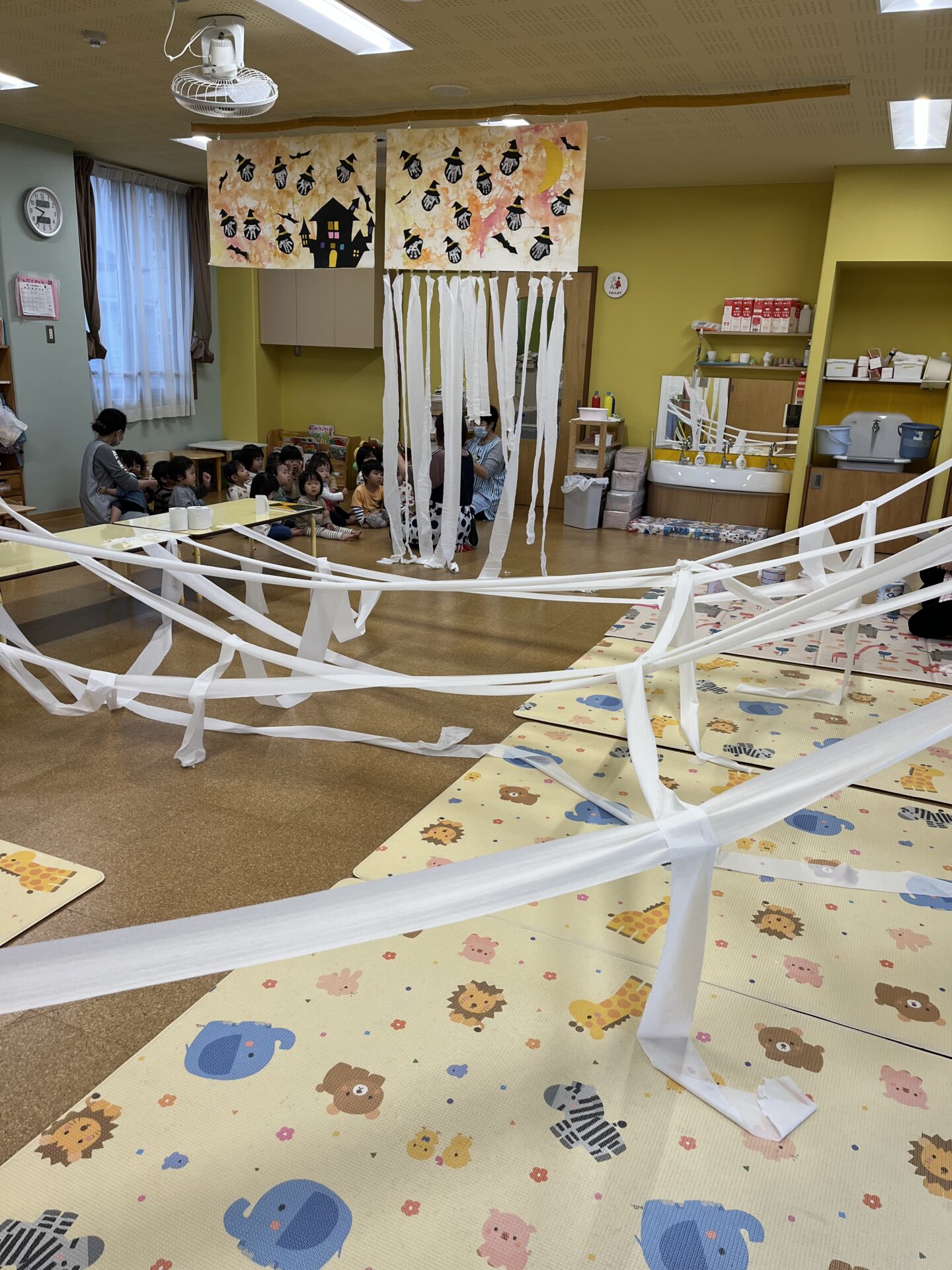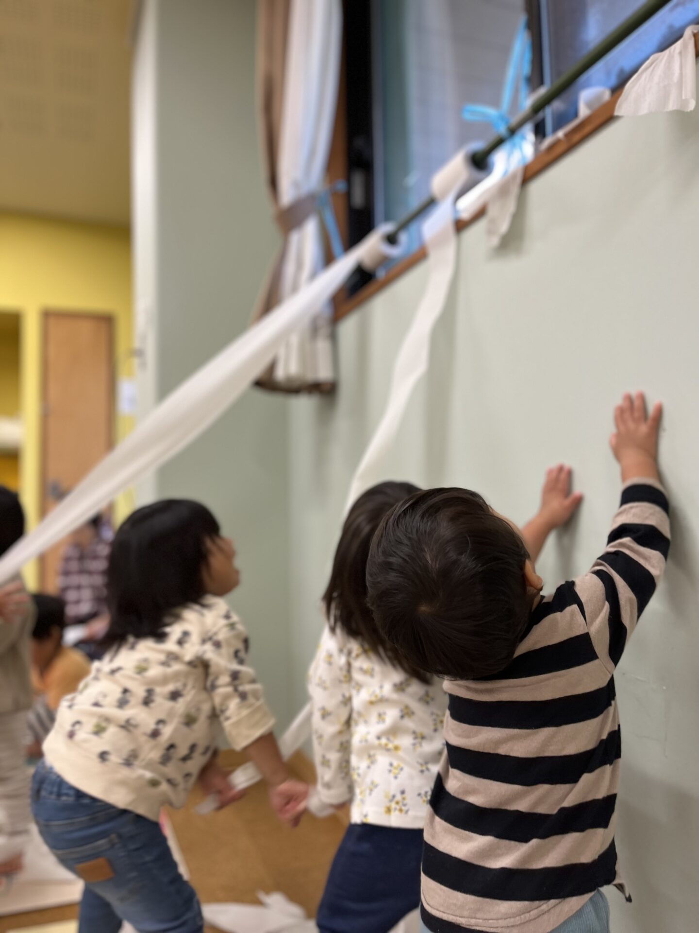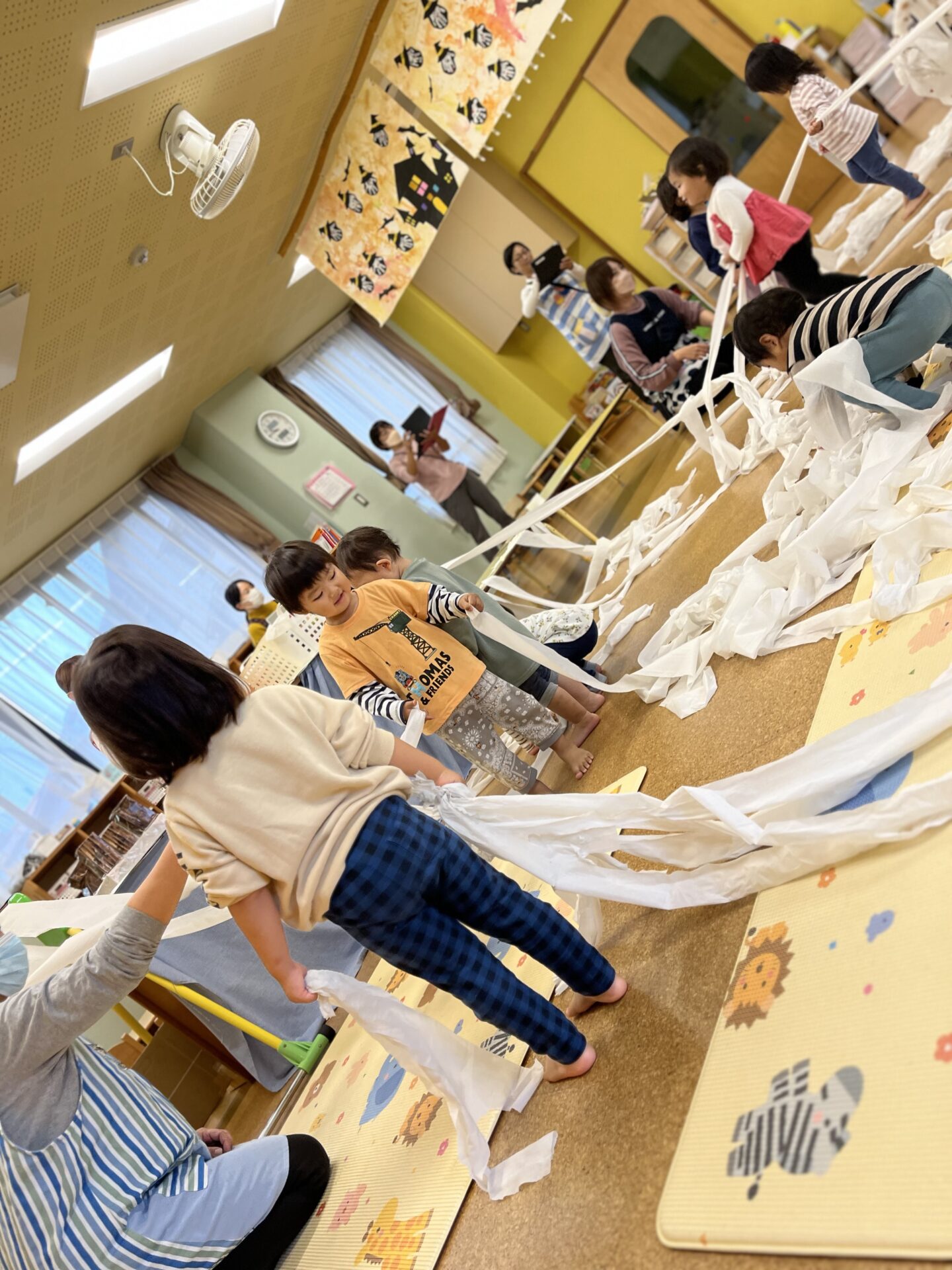 保育室に、トイレットペーパーを張り巡らせ、準備完了です!