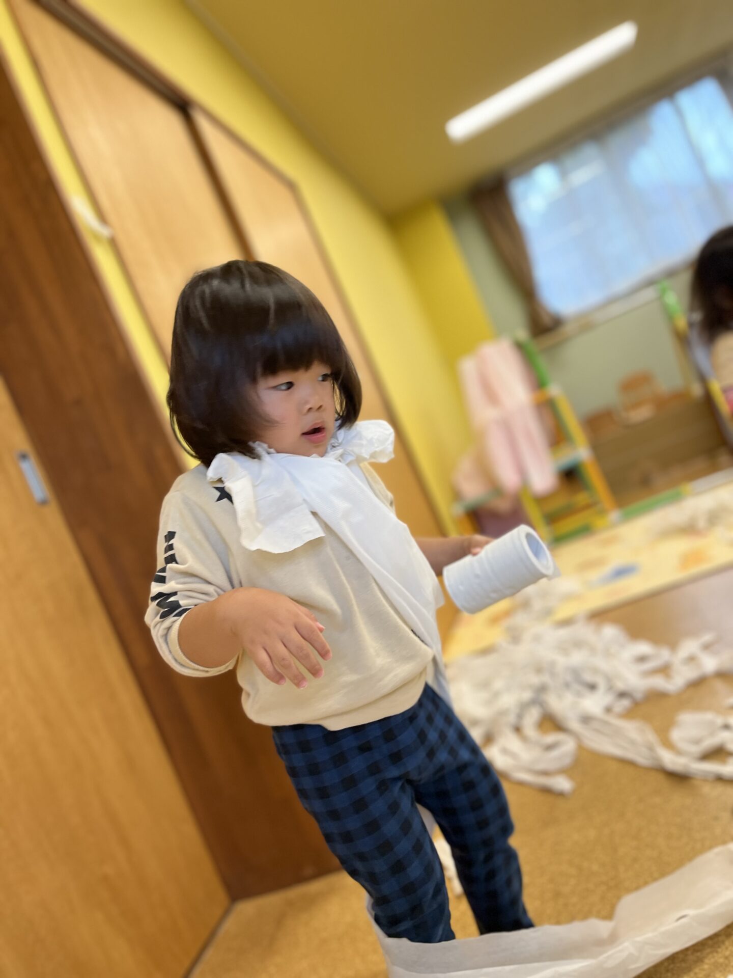 ゼスチャーで「からだにまきつけてー」とアピールしているお友だちを発見💡 子ども達のイメージを汲み取って、お手伝いしました♪