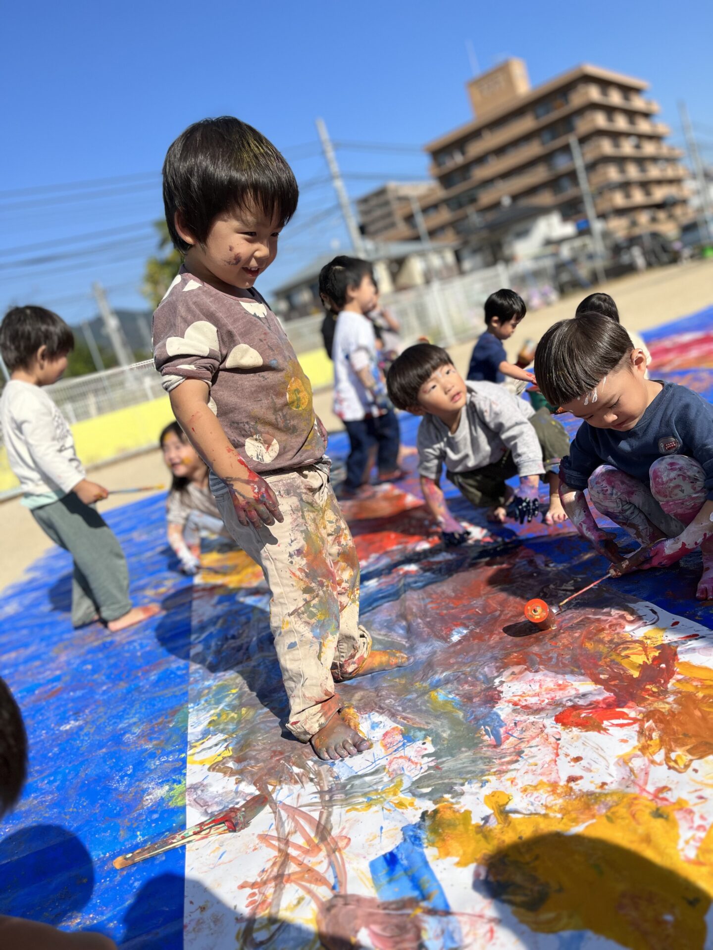 子どもたちのエネルギーを表現するべく、園庭で思いっきり絵の具遊びに挑戦です。