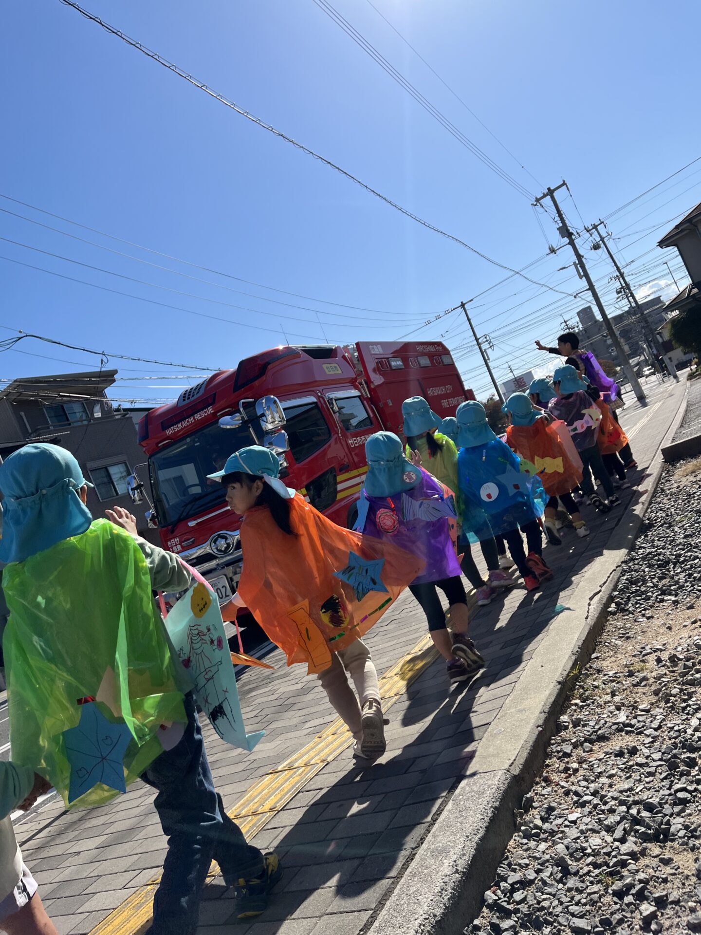 消防車とすれ違って、消防士さんに手をふってご挨拶しました。