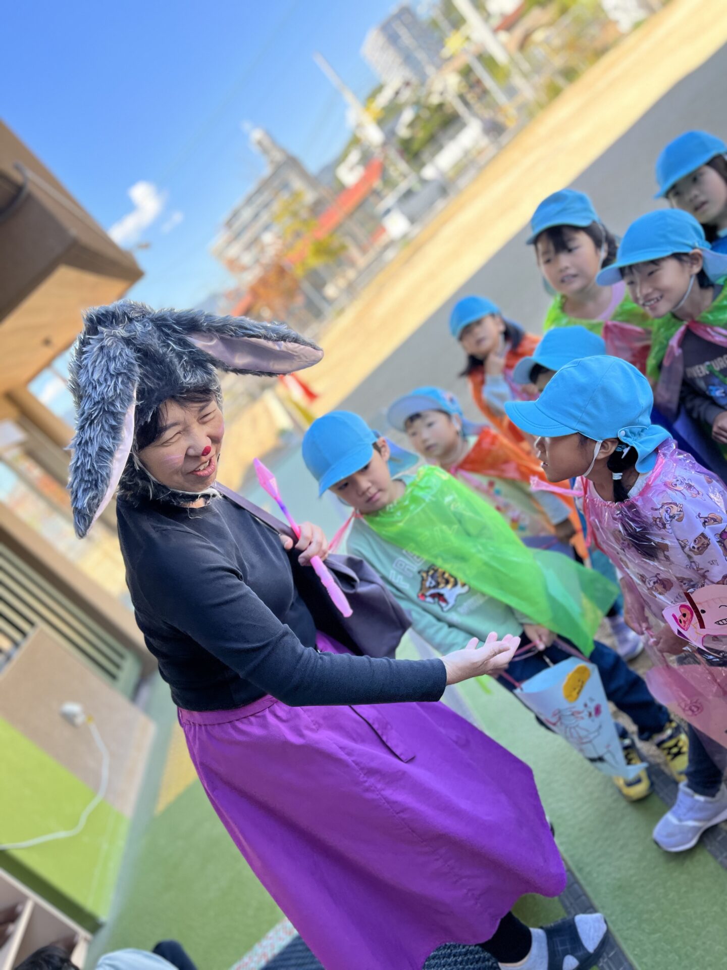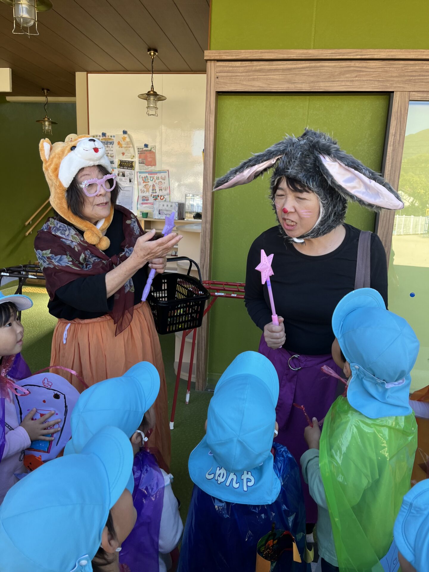 「パレードから帰ってきたら、うさぎさんときつねさんが保育園に遊びにきてるから、みつけてtrick or treatっていうんだよ。そしたら、お菓子をもらえるかもしれないよ。」と…。