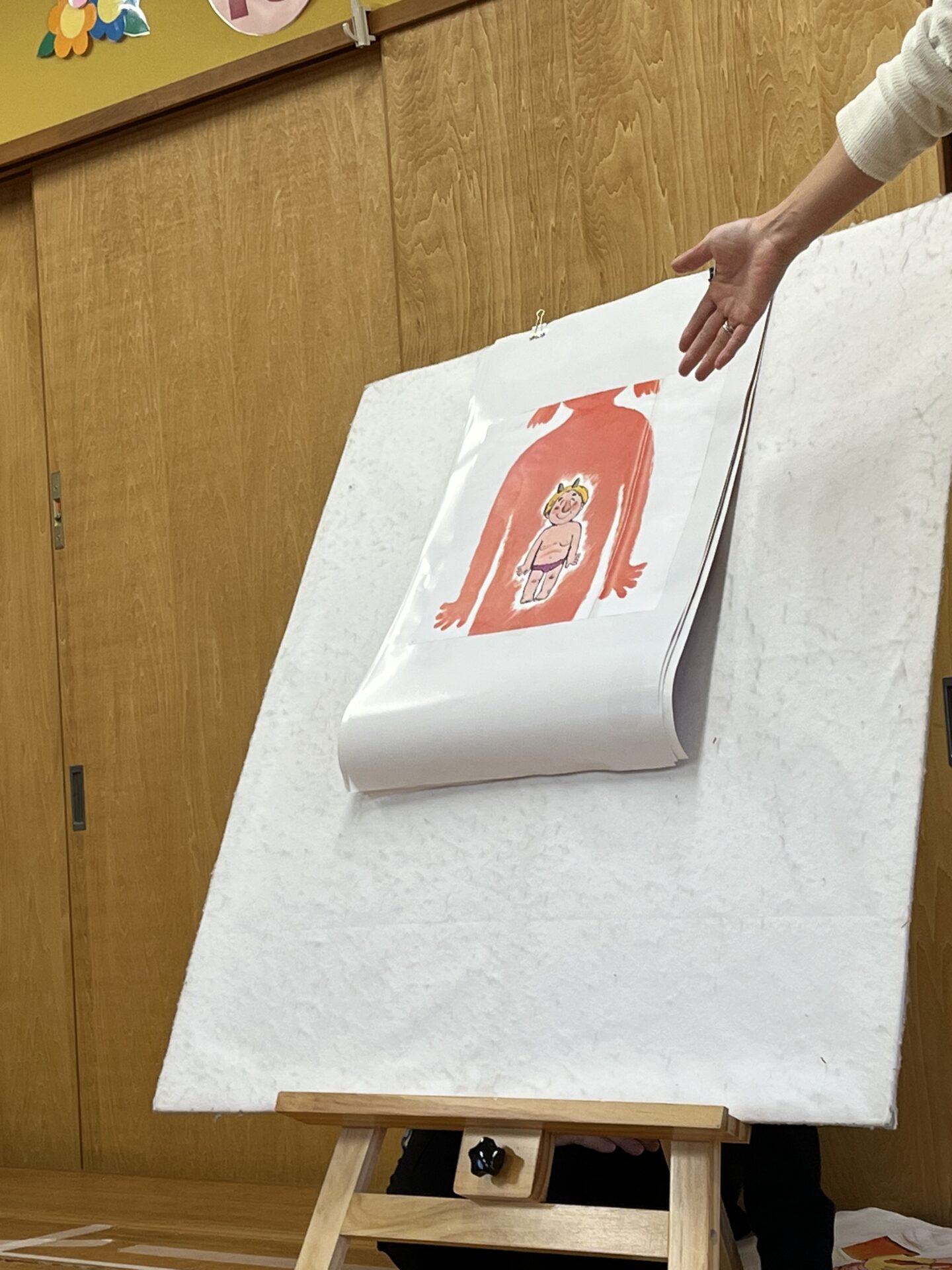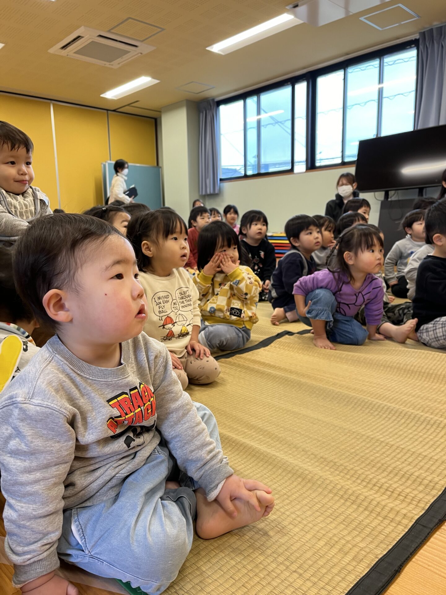 さて、会が始まると、鬼のパンツを歌ったり、節分の由来を聞いたり、「おなかの中におにがいる」のお話をきいたりしました。