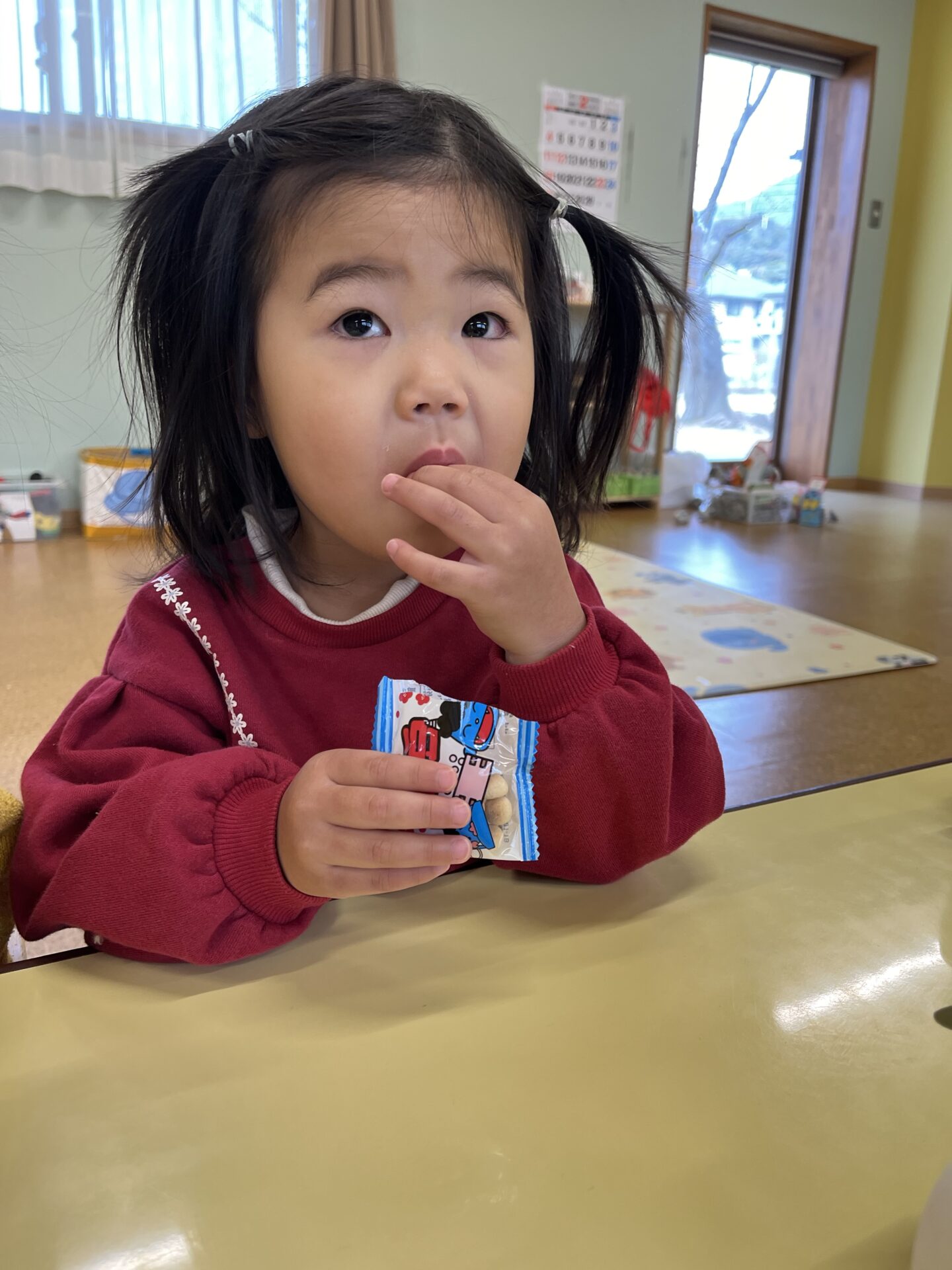 豆まきのあとは、数えの年の数だけ、福豆を食べる習わしがあるのですが、保育園では、豆の提供が難しいため、「きなこボーロ」をみんなで食べました。これが、けっこう美味しいのです😋