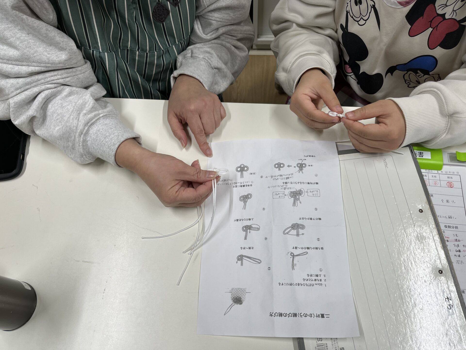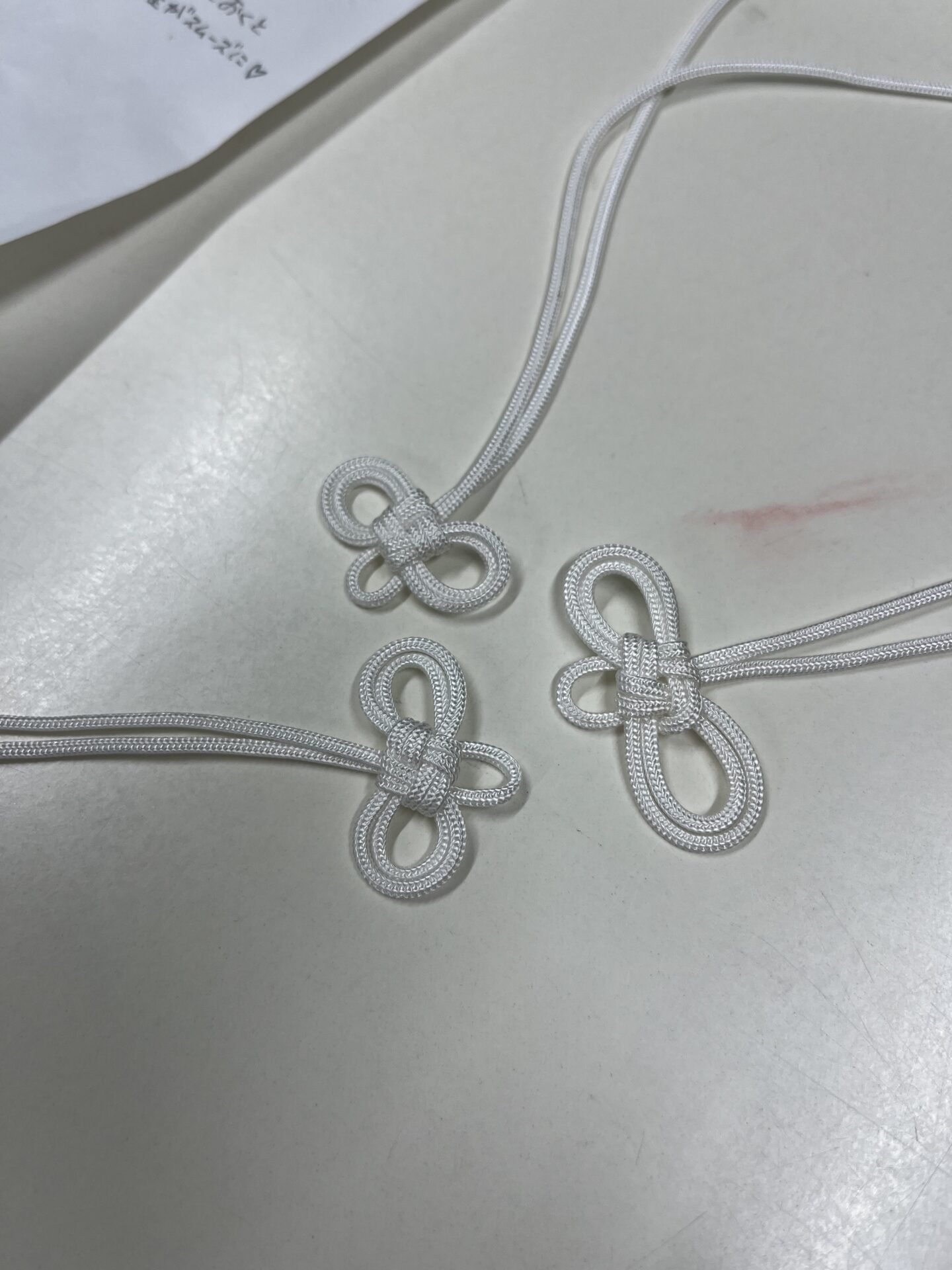 お守りの口を閉じる紐の結び方を「かのう結び」というのですが、これを50本作らないといけませんでした。