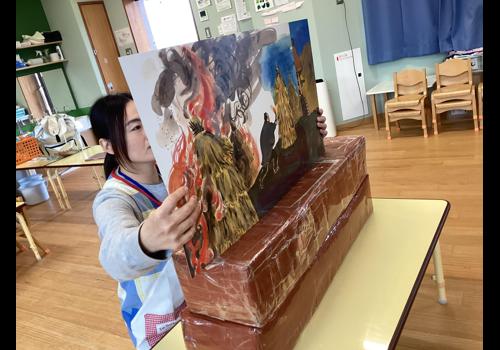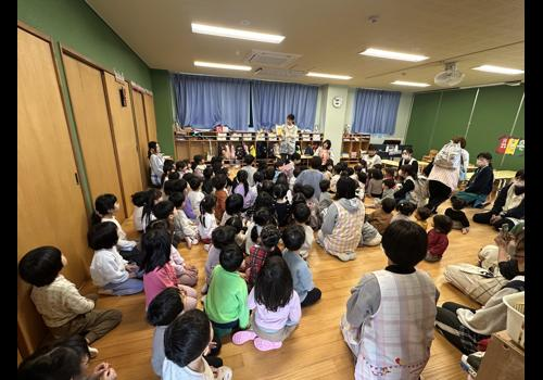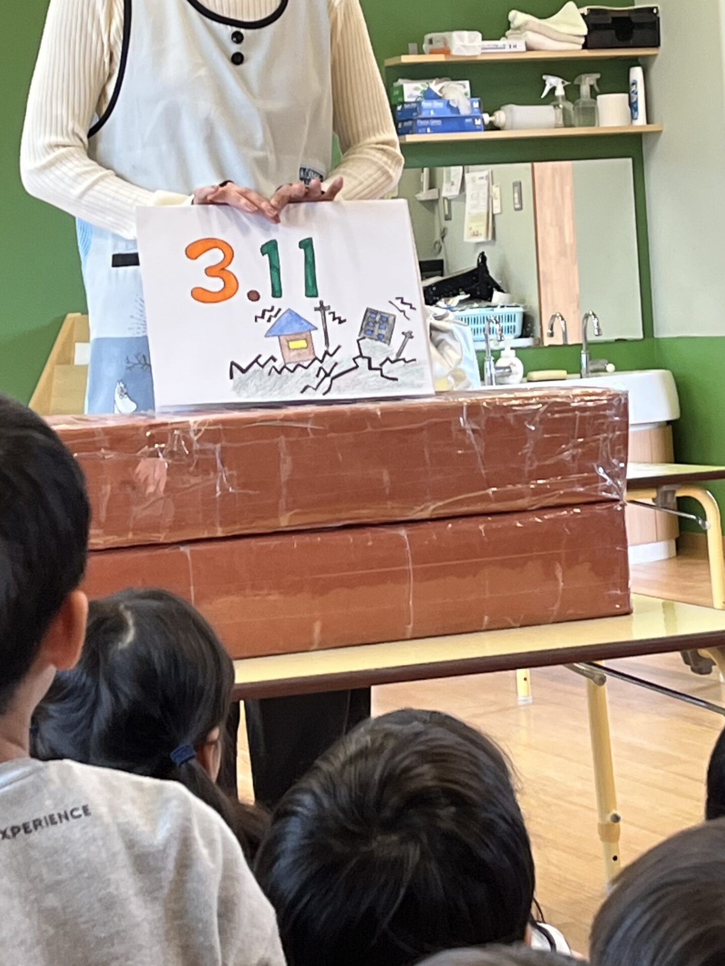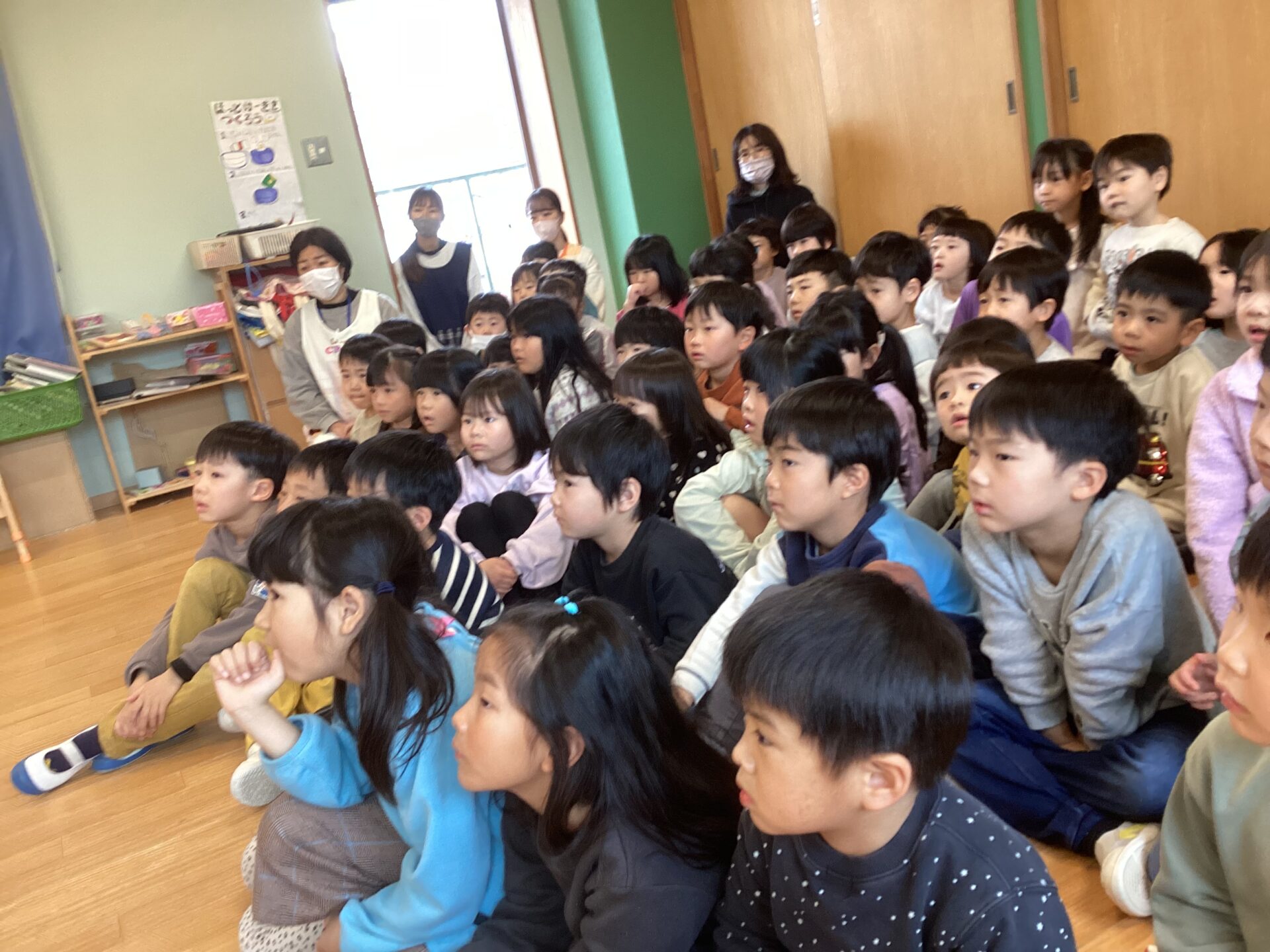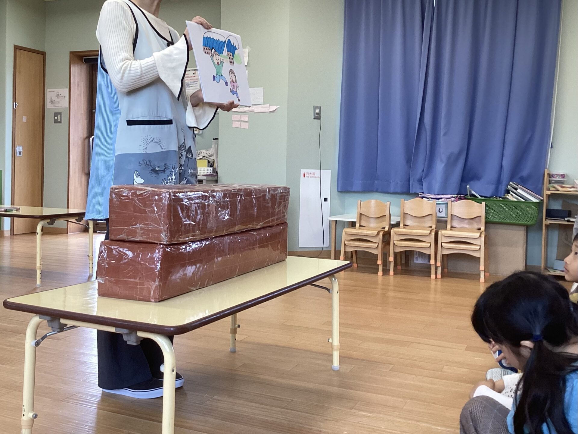 その後、幼児チームさんは、担当保育士の手作り教材や、津波の紙芝居をみて、「地震」や「津波」について、学びました。