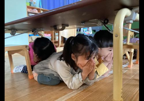 地震の館内放送が鳴ると、園児は担任の指示をきき、ドタドタっと机の下へ。