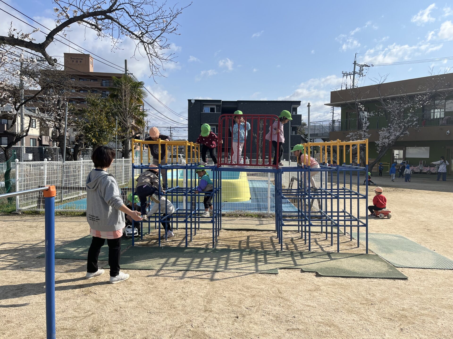 4月4日の朝、園庭でジャングルジムの見守りをしていると…