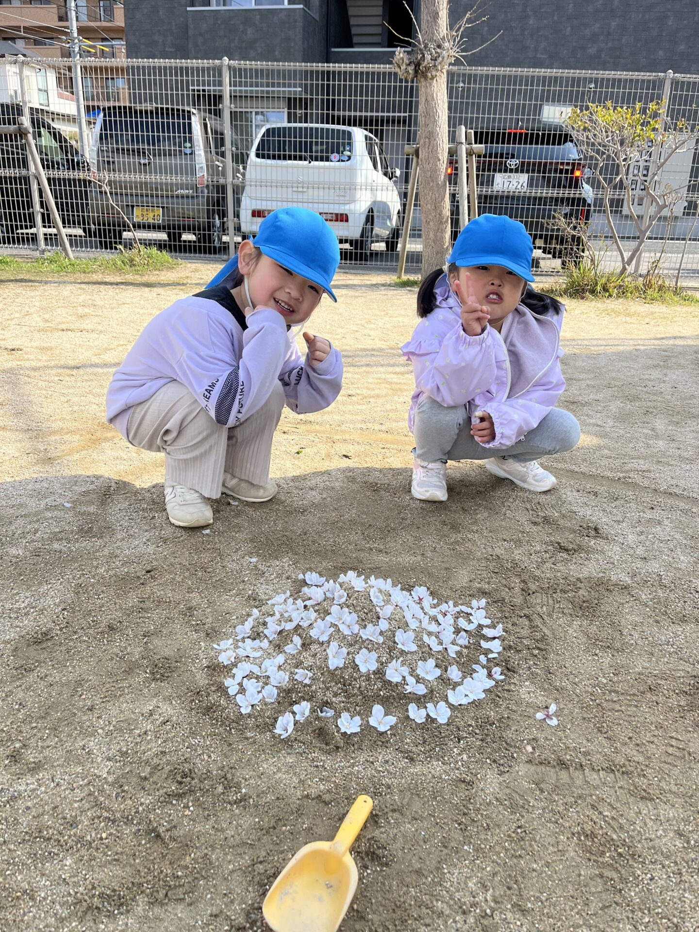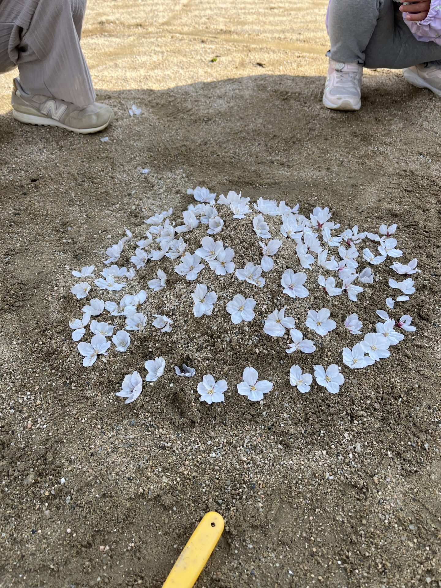 風で散ってしまった桜の花と花びらを集めて、今しかできない遊びを楽しんでいました。
