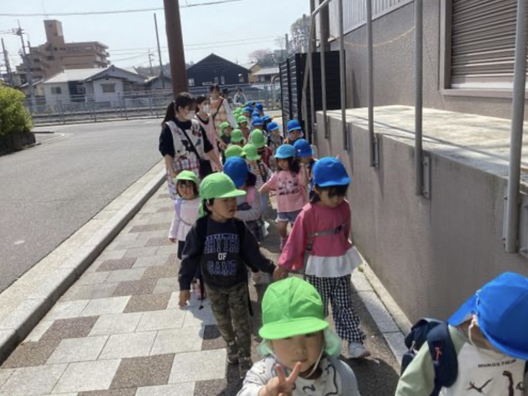 新入園児さんにとっては、保育園を飛び出して、初めてのおさんぽでしたが、サブリーダーのそらチームさんが手を引いて連れて行ってくれたので、なんとも心強いおさんぽになりました。