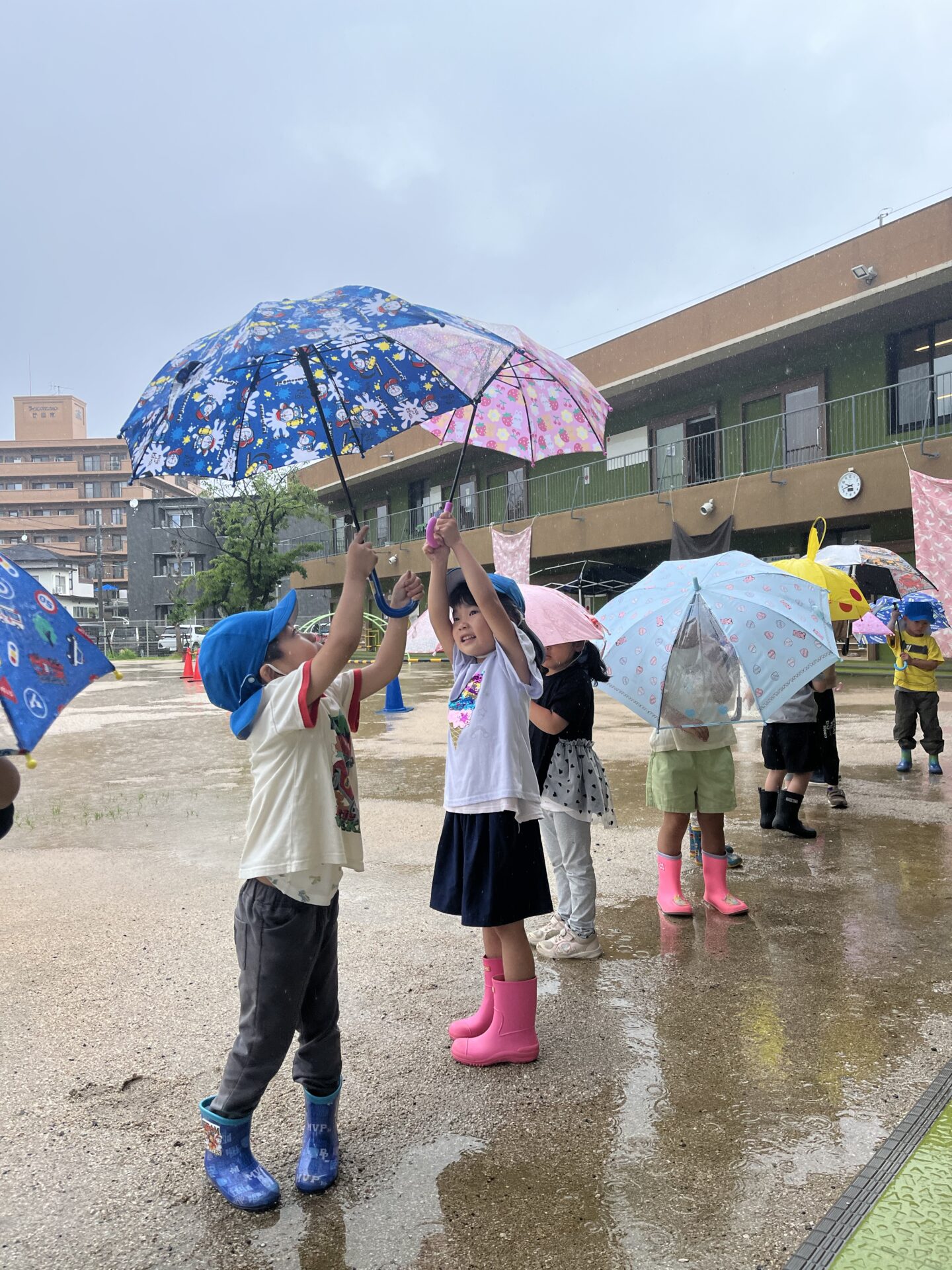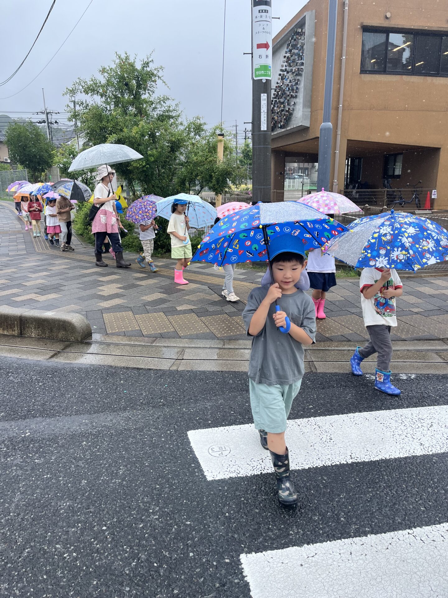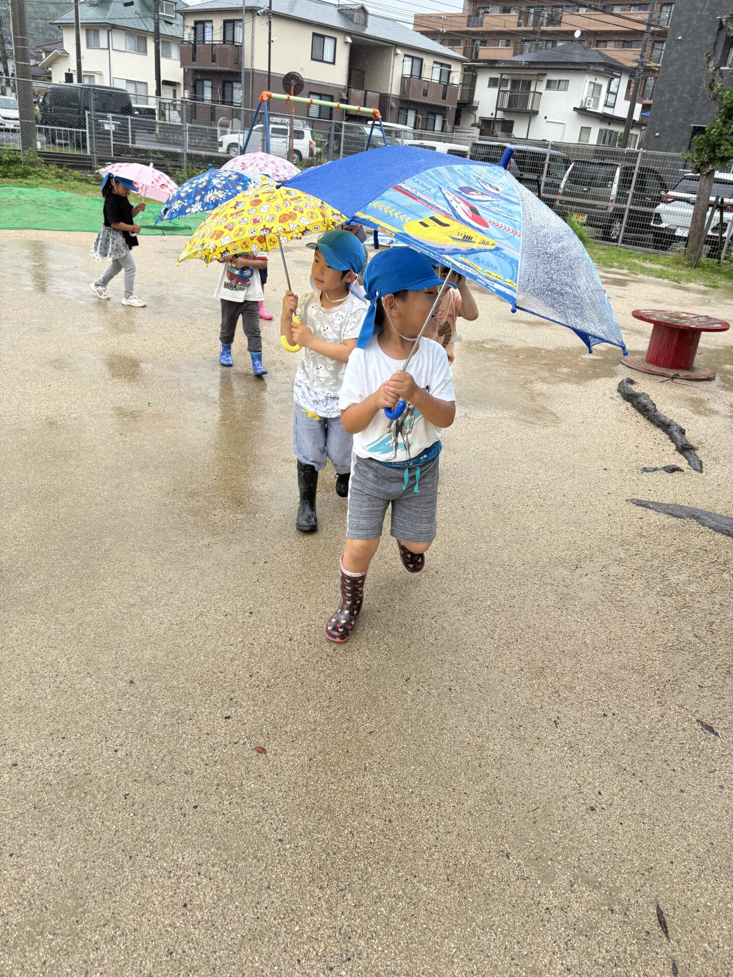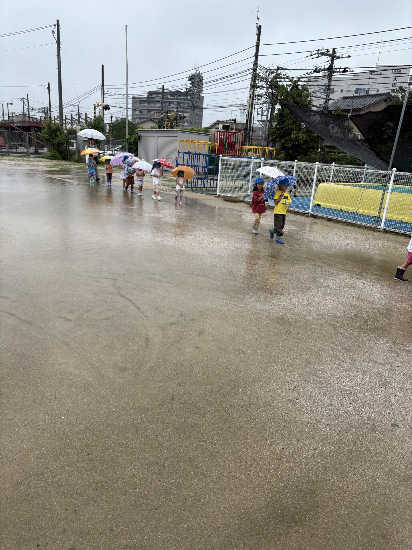 21人が一列になり、雨音を聞きながら、自分の傘や長靴、お気に入りの靴を履いて、ウキウキしながら歩きました。中には傘をひっくり返して、傘に雨が溜まるのをお面白がったり、自分が雨に濡れるのを楽しんでいました。水たまりに入るのも、濡れるのも楽しそうなので、何も言わず子どもたちのありのままの姿を楽しみました♪
