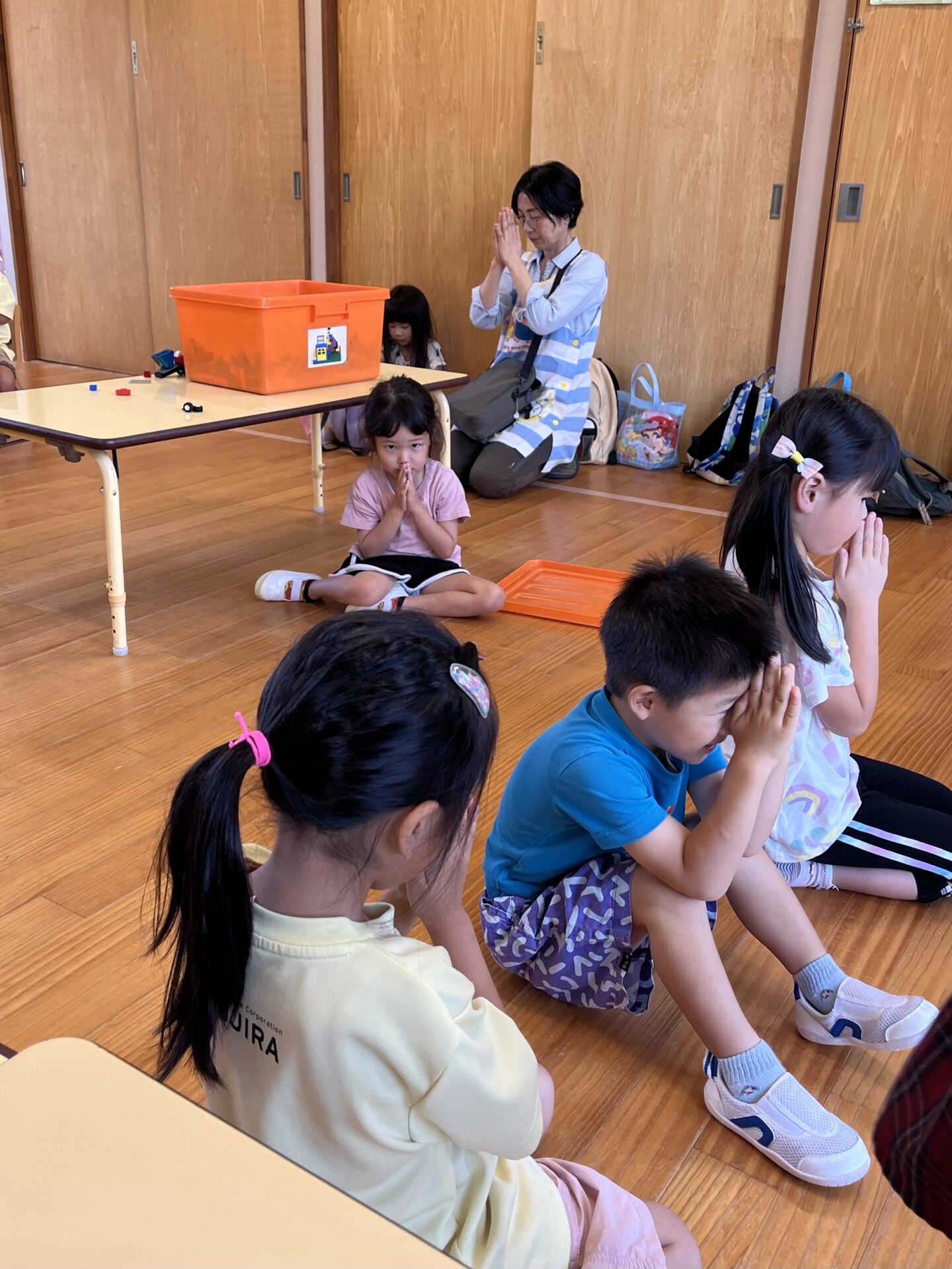 子ども達はあそんでいる最中でしたが、保育士の呼びかけに応じて、手を合わせていました。