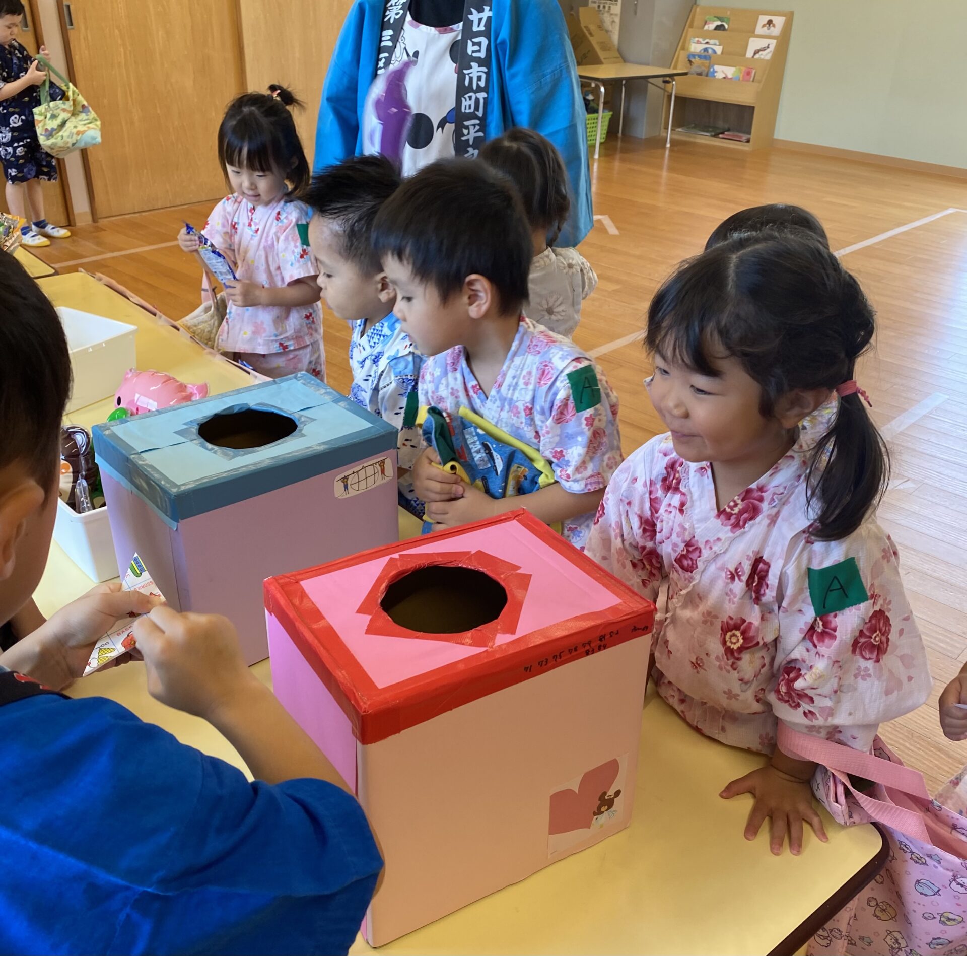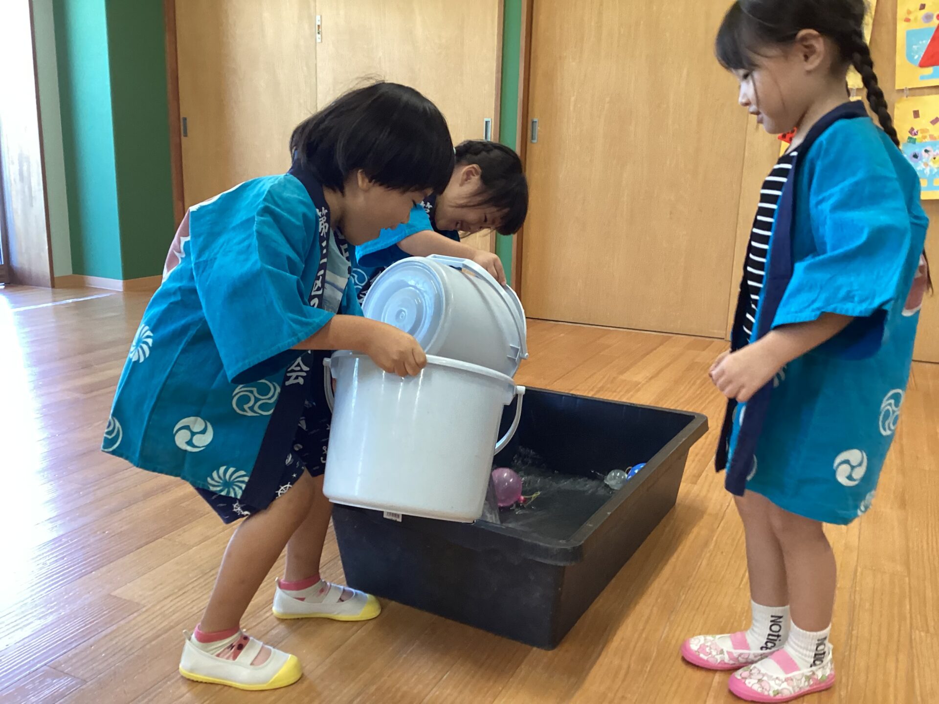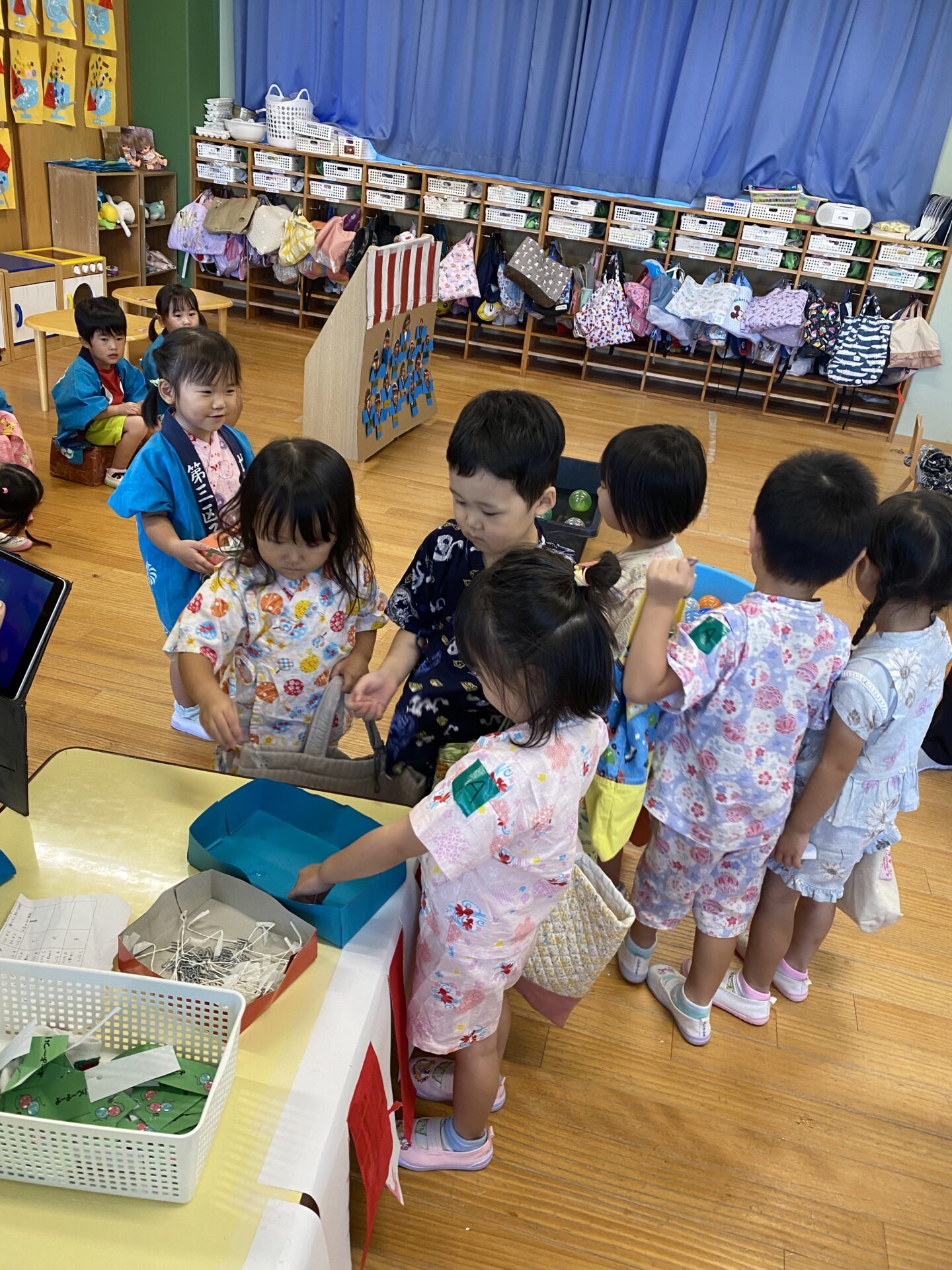 夏祭りでは、ヨーヨー屋さんを担当することになったにじチーム。店員さん役は、グループごとに交代ですることになりました。お客さんとして、ヨーヨー的りを楽しむ心構えは言うまでもなくバッチリ。ですが、「お店の入って何したらいいの?」「・・分かんない」自分たちが店員さんになるというイメージは持ちづらいようでした。そこで、実際に店員さん役をやってみることにしました。