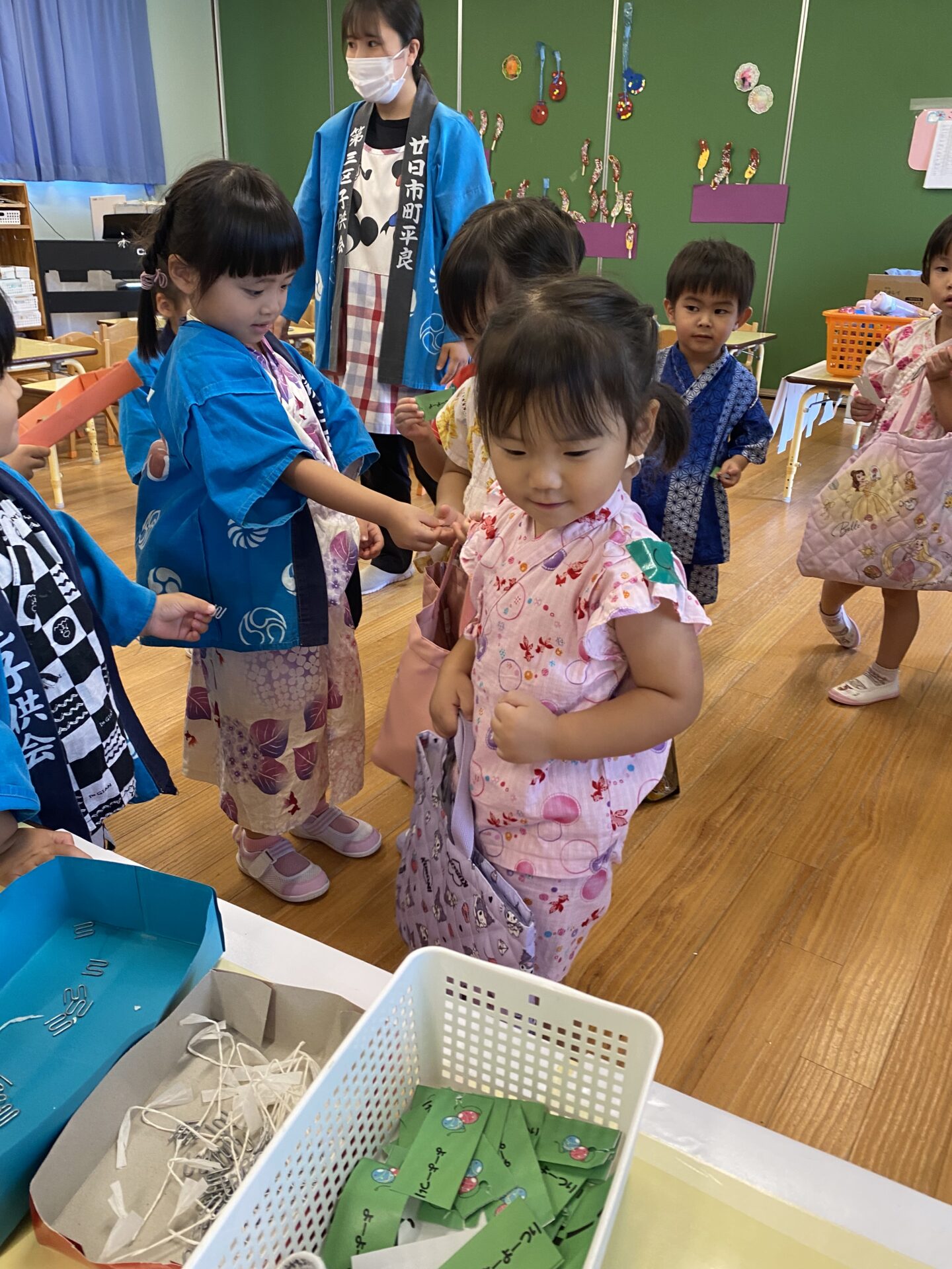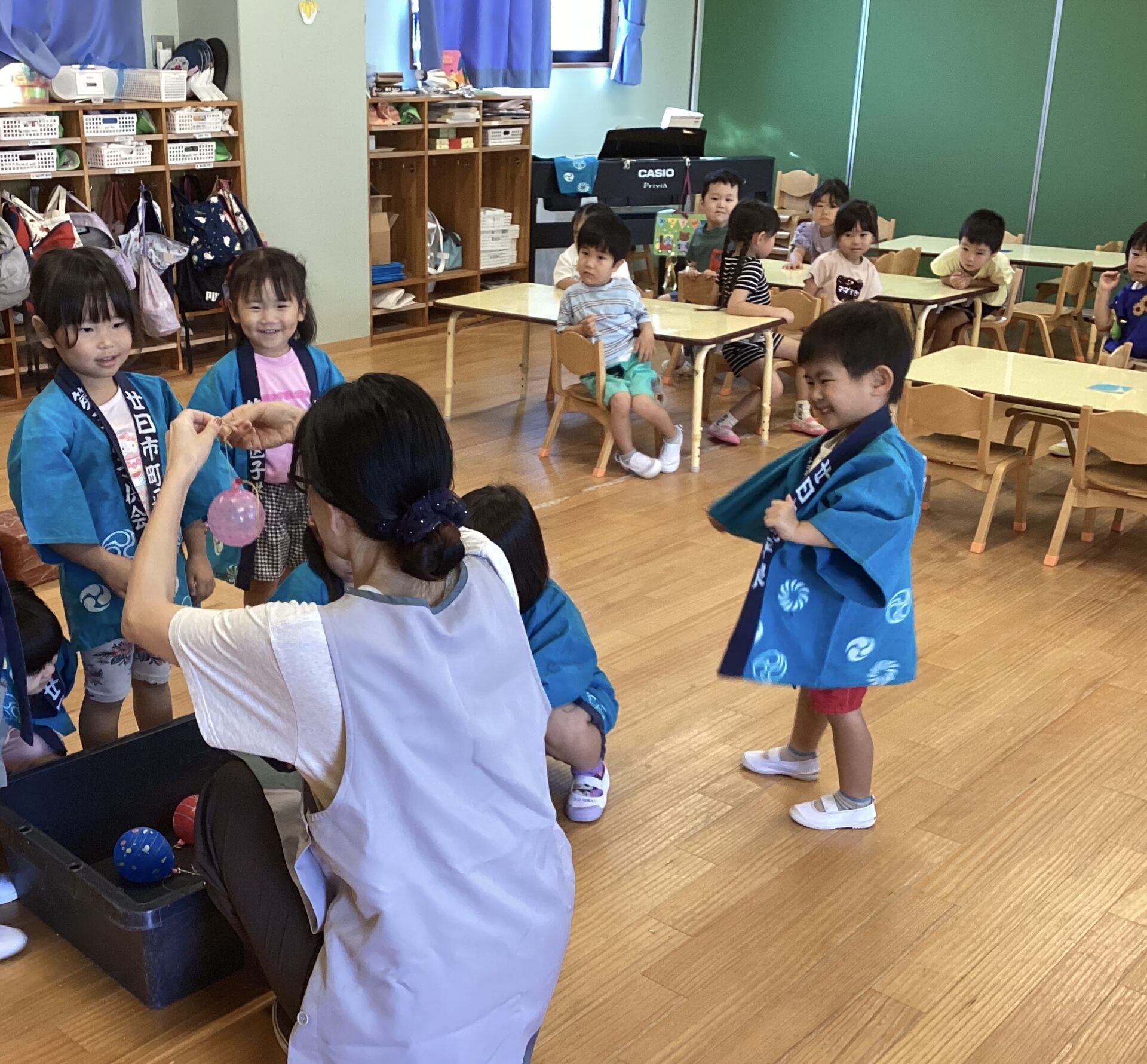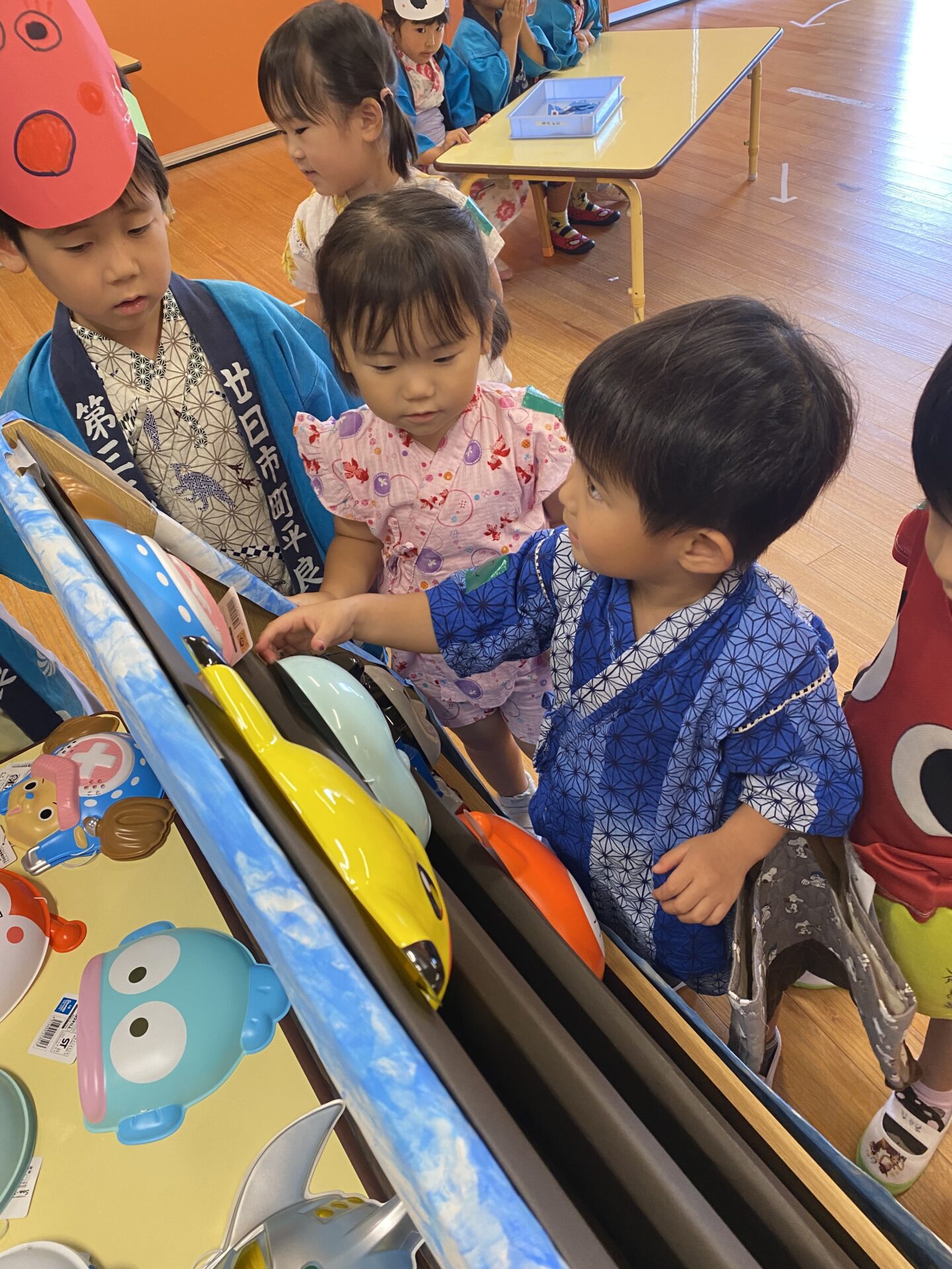 夏祭りでは、ヨーヨー屋さんを担当することになったにじチーム。店員さん役は、グループごとに交代ですることになりました。お客さんとして、ヨーヨー的りを楽しむ心構えは言うまでもなくバッチリ。ですが、「お店の入って何したらいいの?」「・・分かんない」自分たちが店員さんになるというイメージは持ちづらいようでした。そこで、実際に店員さん役をやってみることにしました。