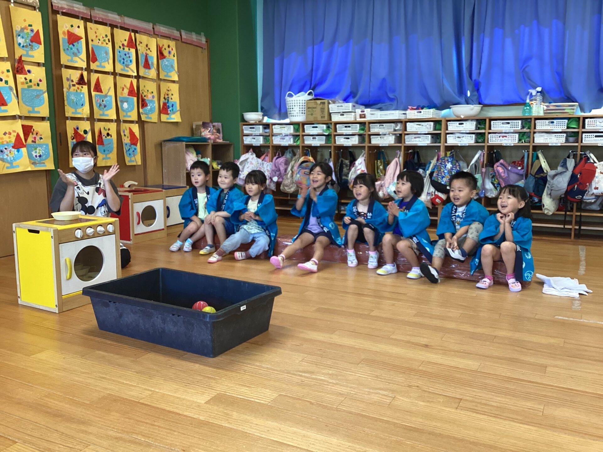 何回か繰り返した後に、「お店屋さんは、なんて言ったらいいかな?」と問いかけると、「いらっしゃいませって言う!」「聞こえんかったら来てくれんよね。大きい声の方がいいんじゃないかな?」と、どんどんとイメージが膨らんでいきました。