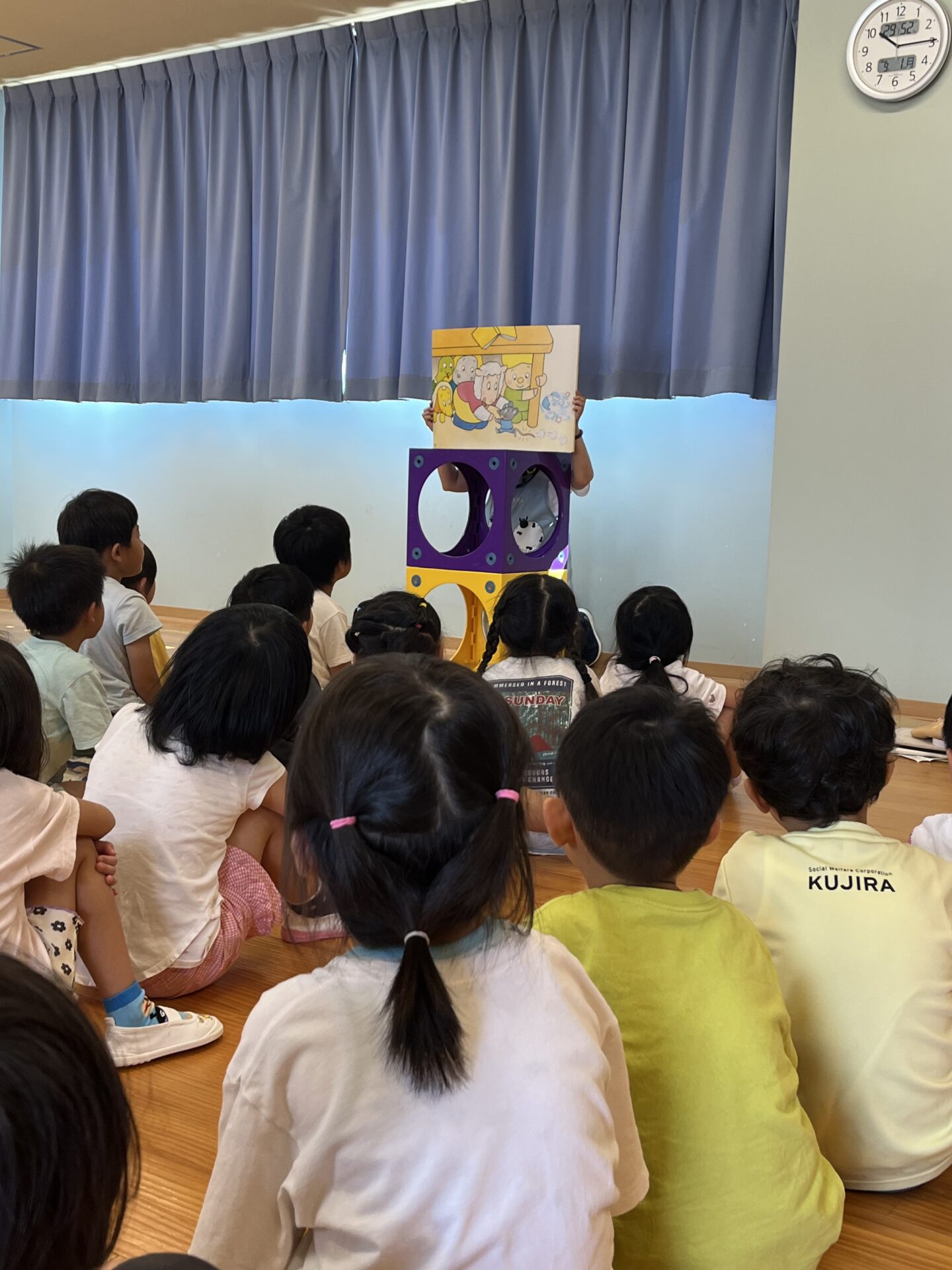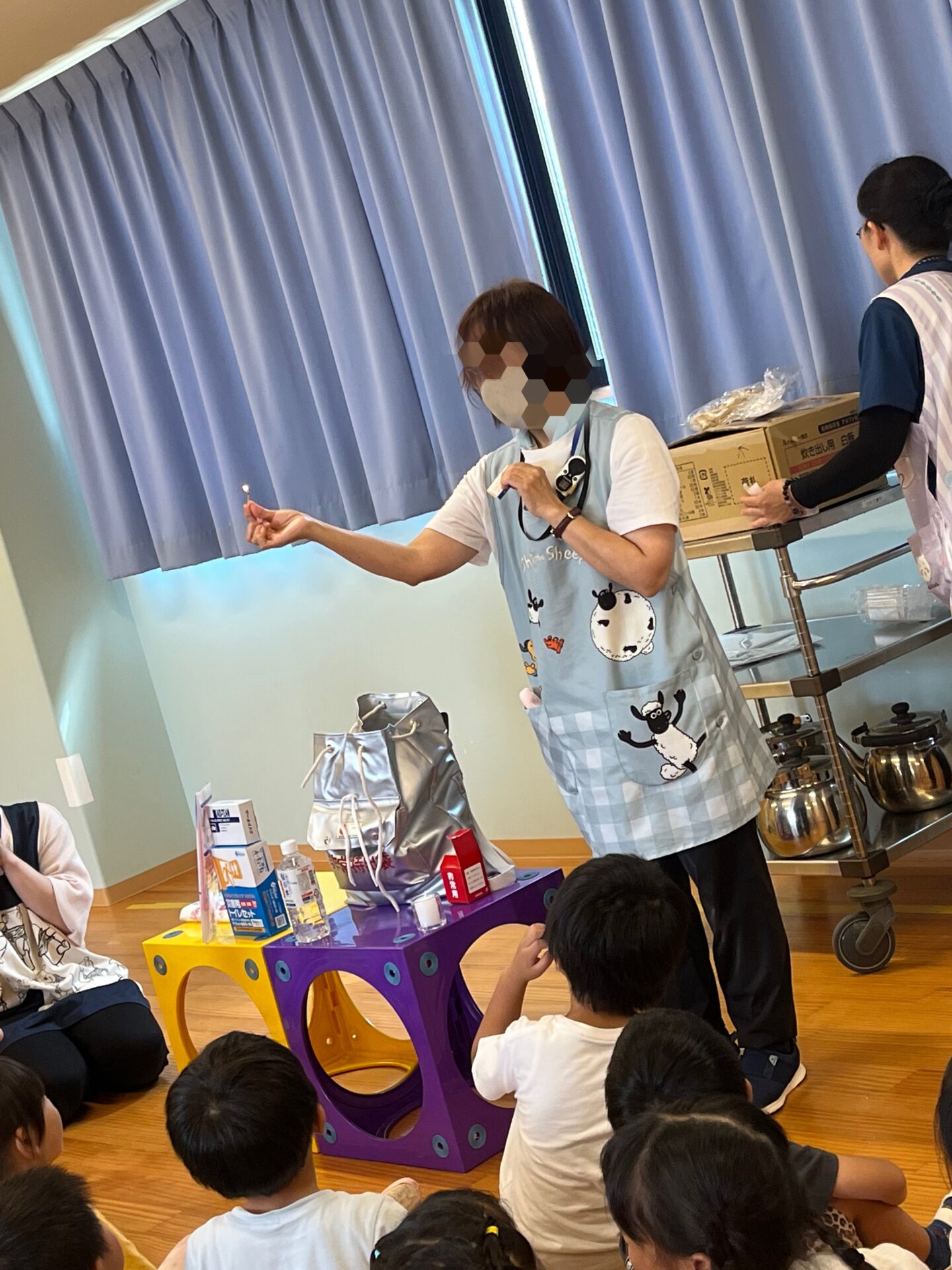 そのあとは、幼児さんだけで集まって、紙芝居をみたり、非常食のアルファ米を作るところをみたり、防災バックの中身をみたりしました。