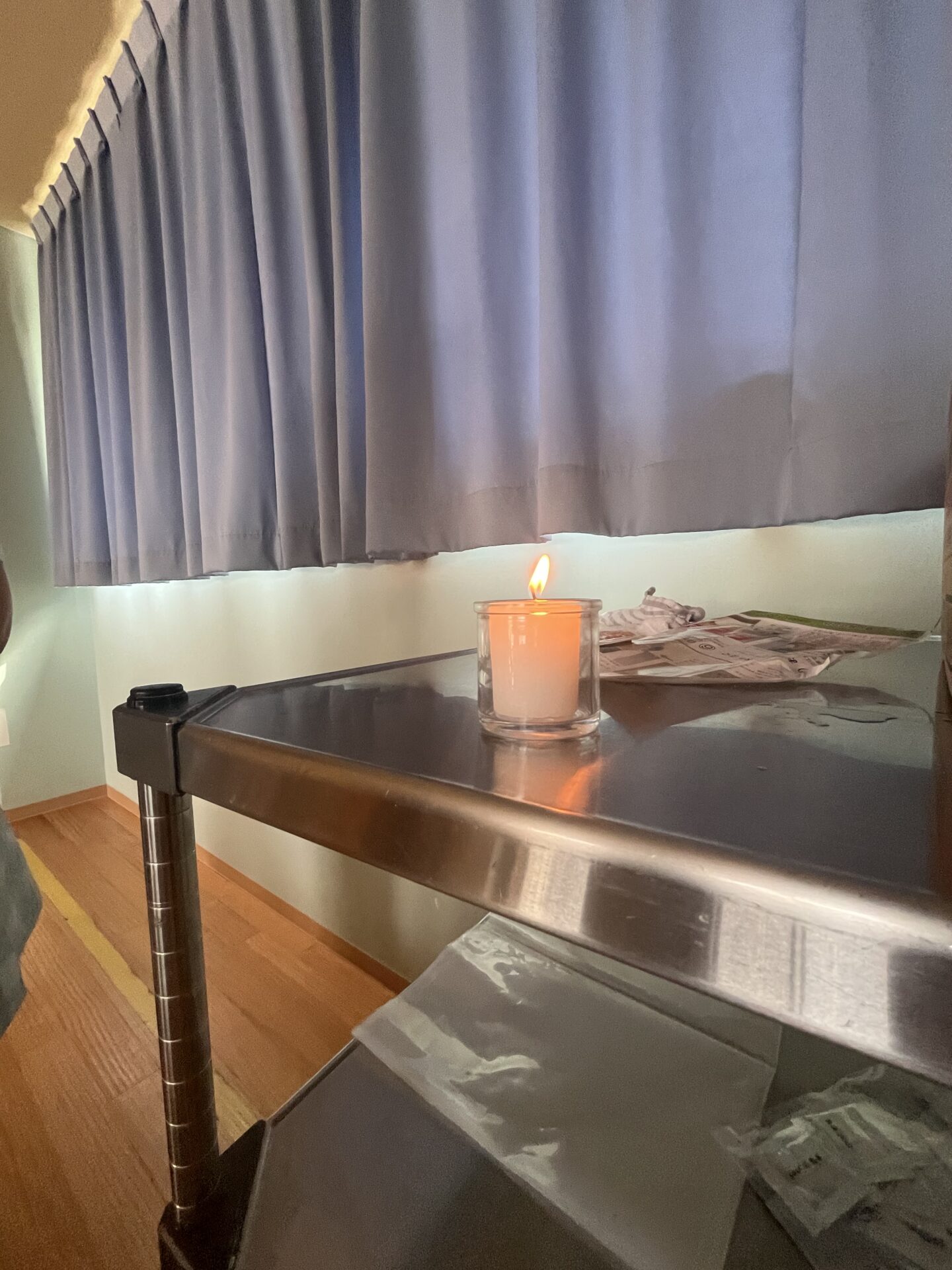 マッチで非常用ろうそくに火を灯して、停電時の暗さも体験しました。