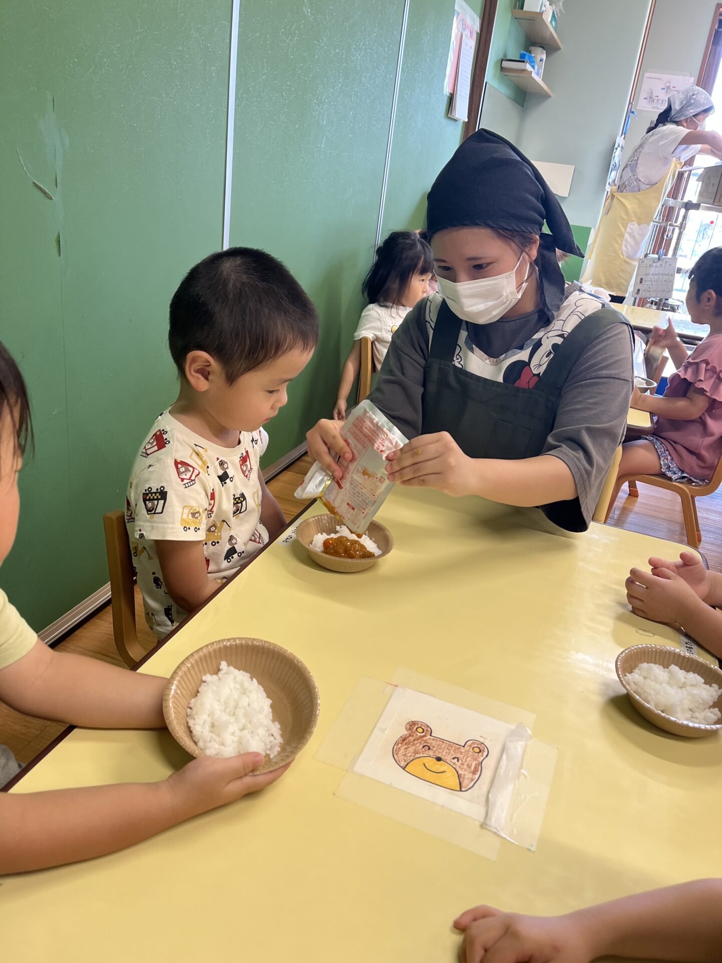 今日の給食は、いつもの給食と違い、保育園に備蓄している非常食を食べました。非常時には電気やガスが使えず、給食が提供できない可能性があります。限られた備蓄食材をみんなで分け合って、常温の食事を食べる経験は、いざという時にきっと役立つと思っています。