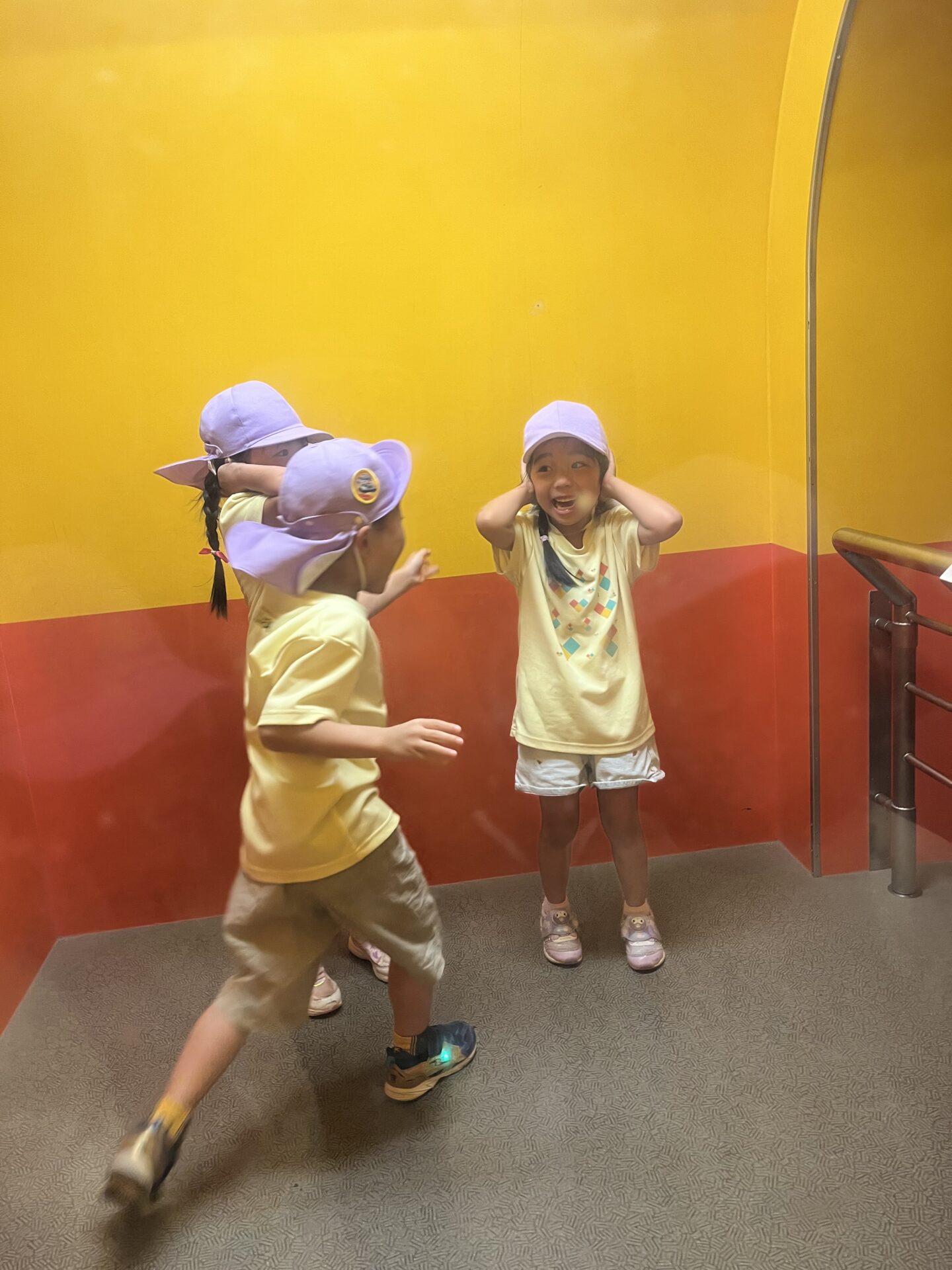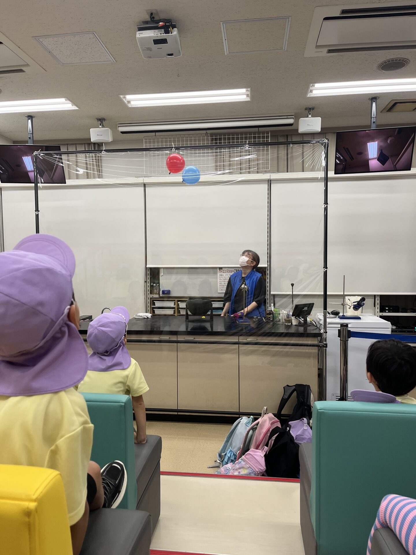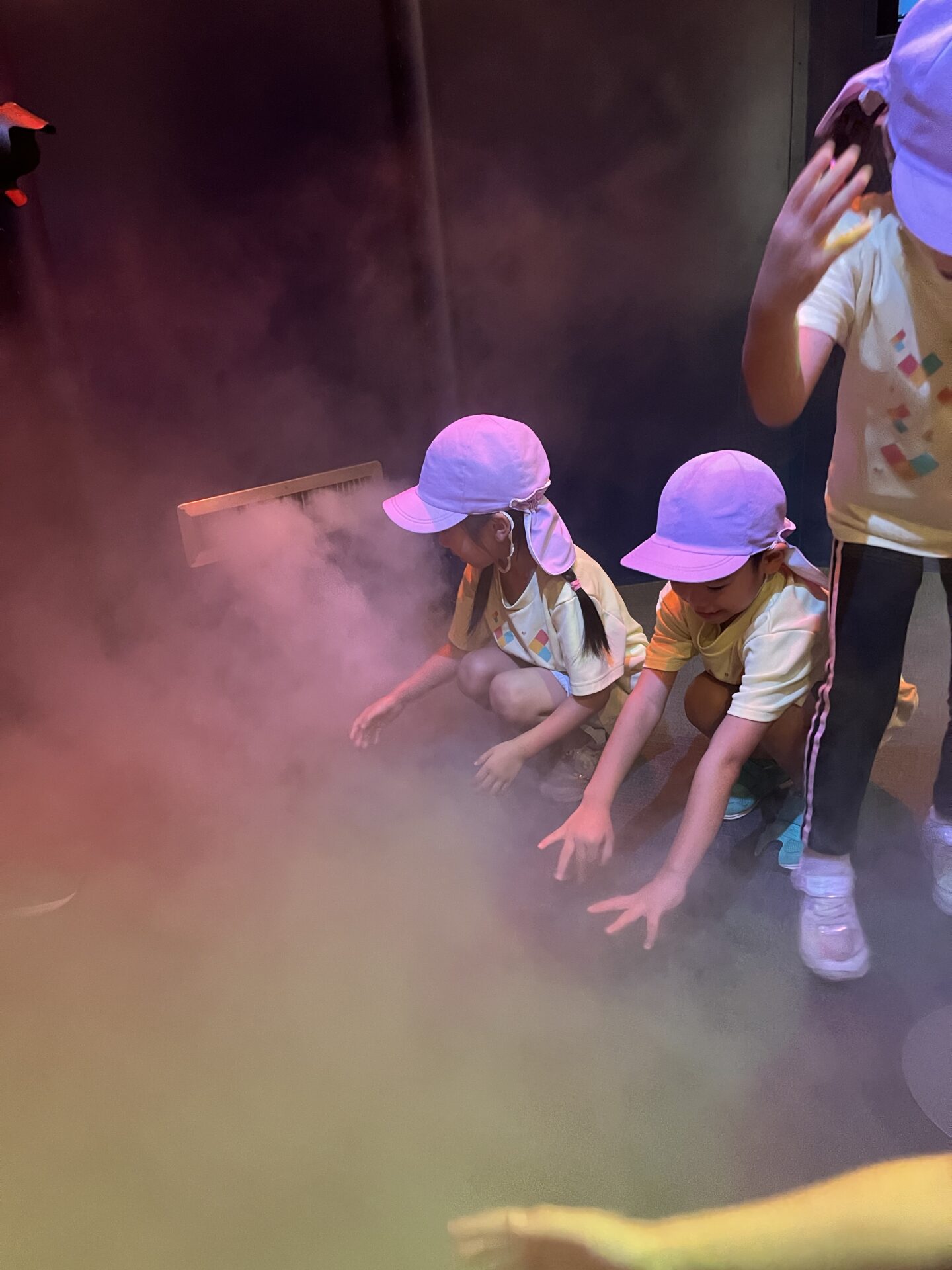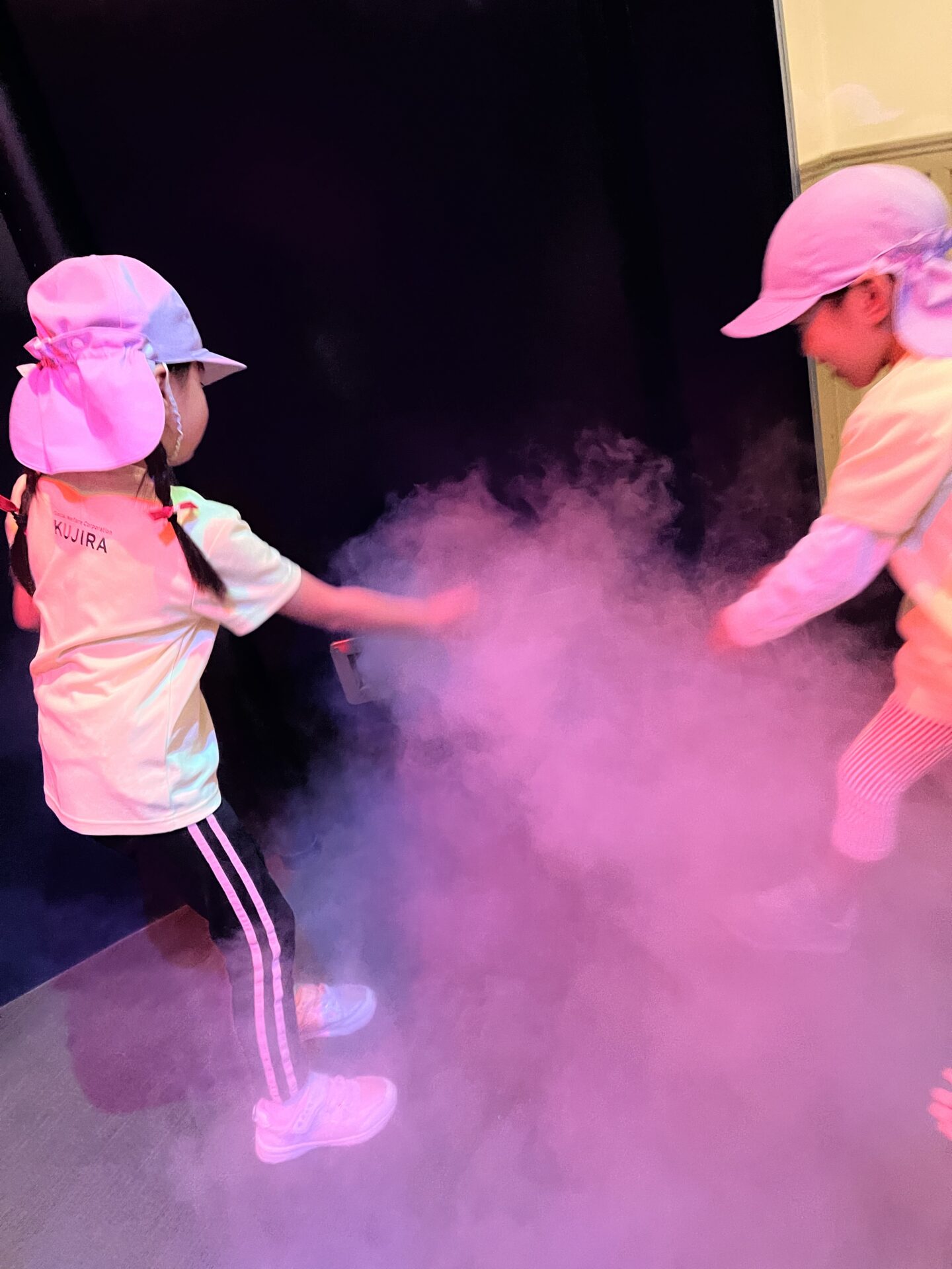 次は、雷を発生させる装置の前で、稲妻の音を聞き、ピカッ⚡️と光る光景にびっくりして、思わず耳を塞ぐくじらチームさん