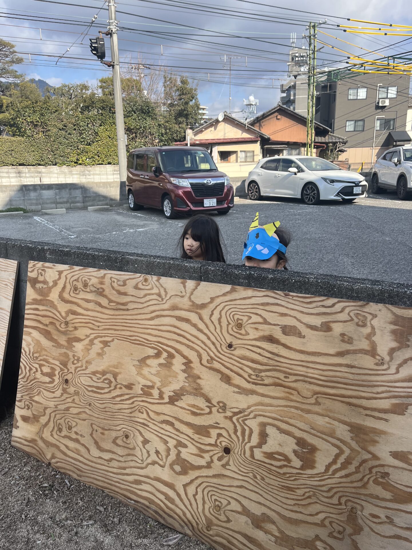 豆まきの後は、「おじいちゃん、おばあちゃん、大丈夫ー?」と呼びかけると、カーテンからこっそりおじいちゃんが顔をのぞかせてくれ、大丈夫だったようです。