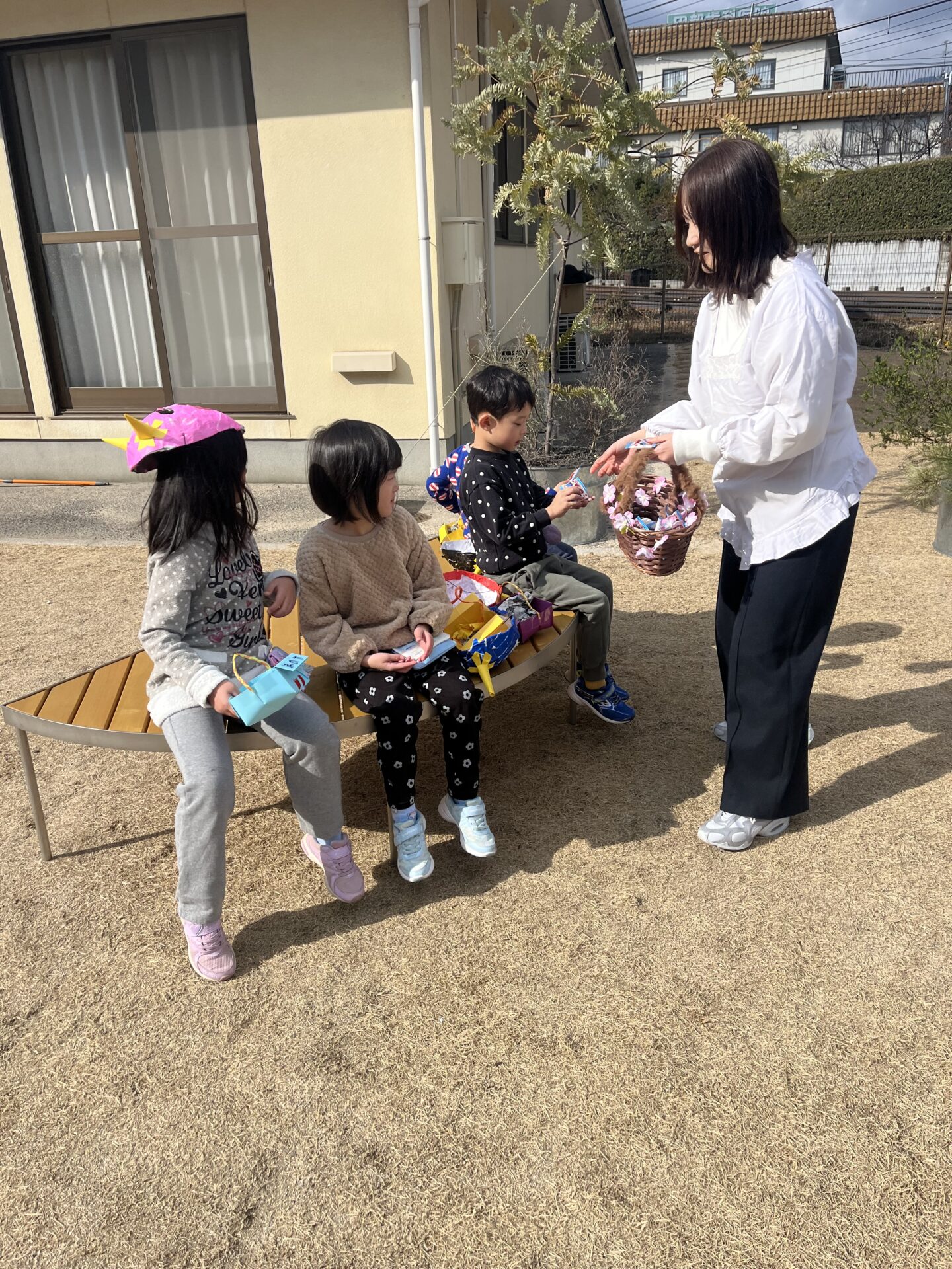 鬼退治をした後は、福の神が来て、お菓子をくれましたよ。「ありがとう」と言われると嬉しいね!