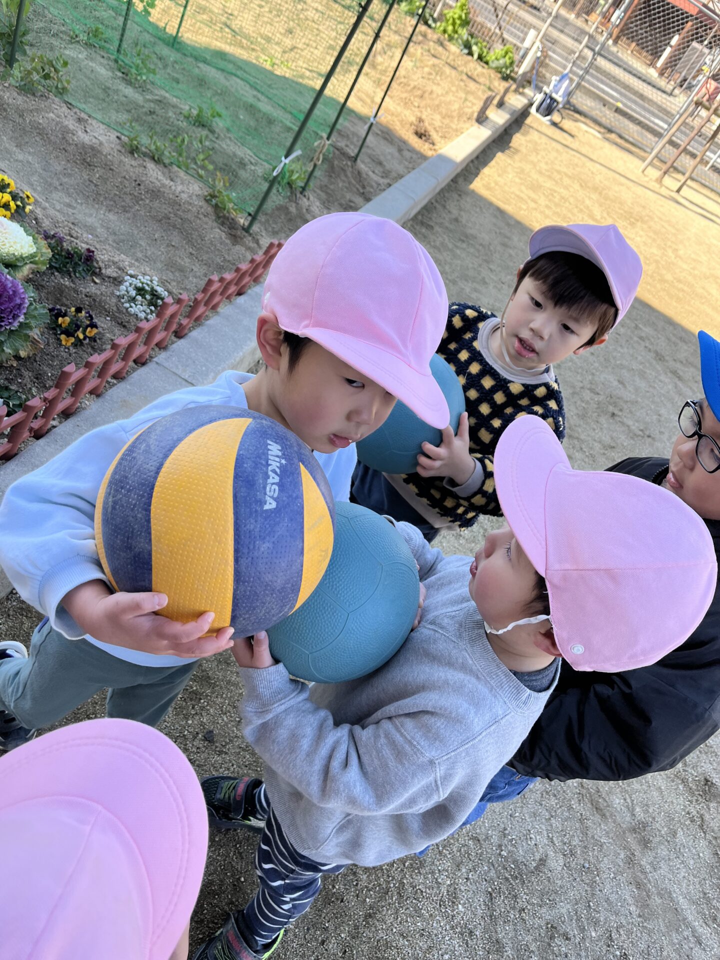 園庭で、あめチームの男の子達が、青いボールの取り合いをしていました。